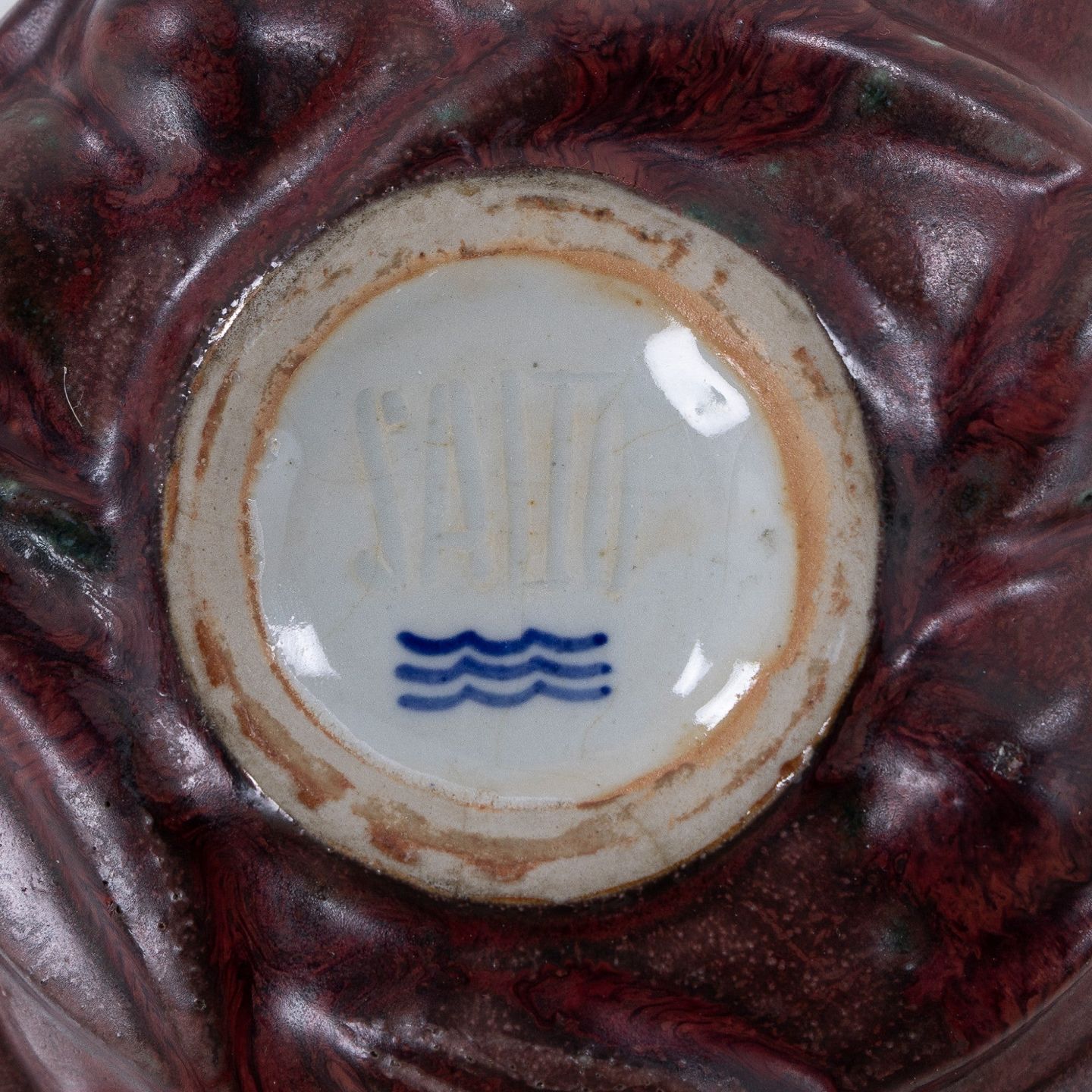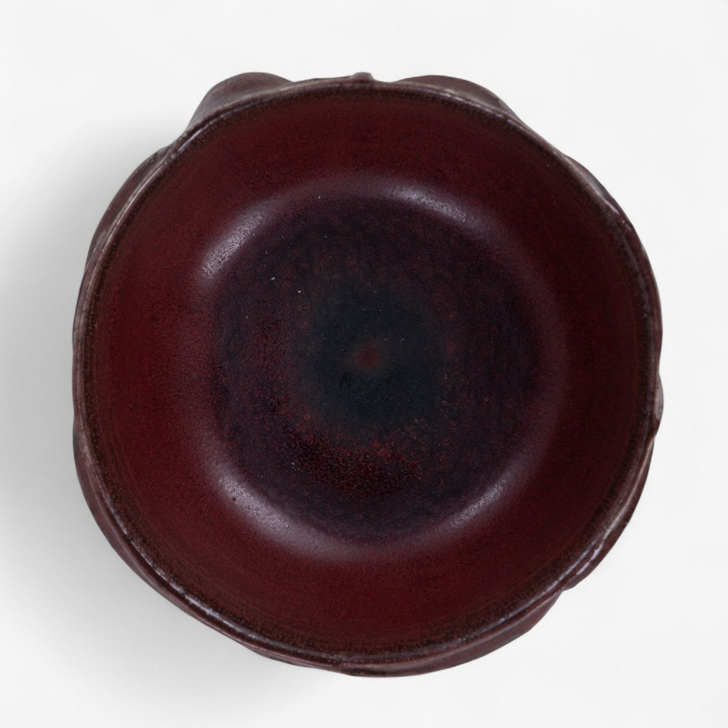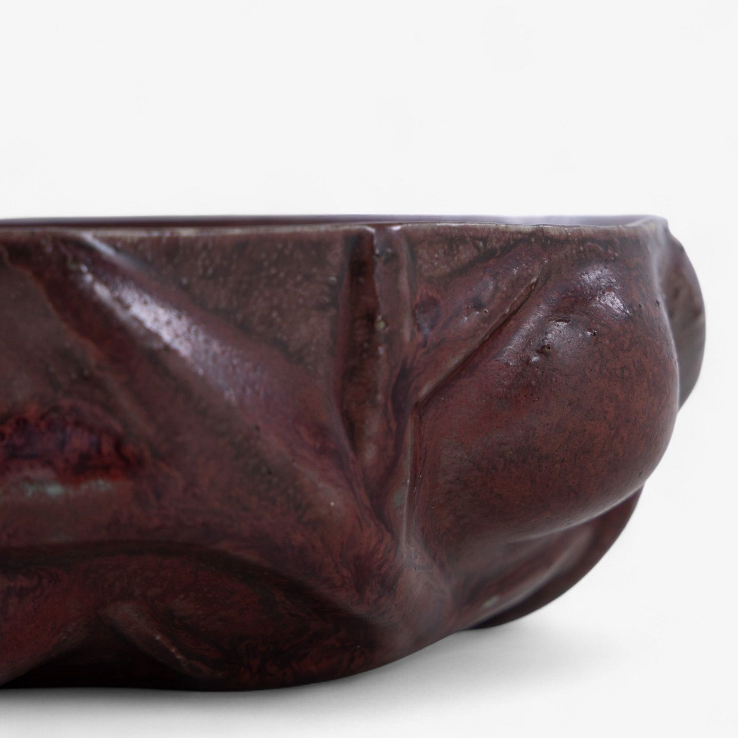 Stoneware bowl with modeled fruits in oxblood glaze. Signed.
