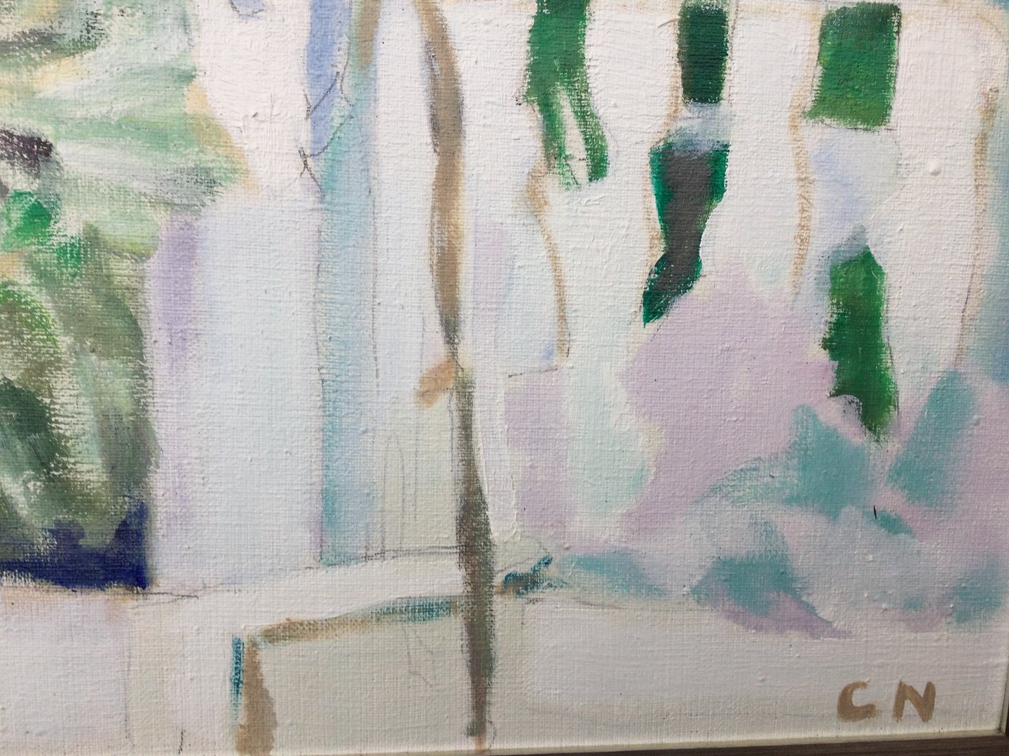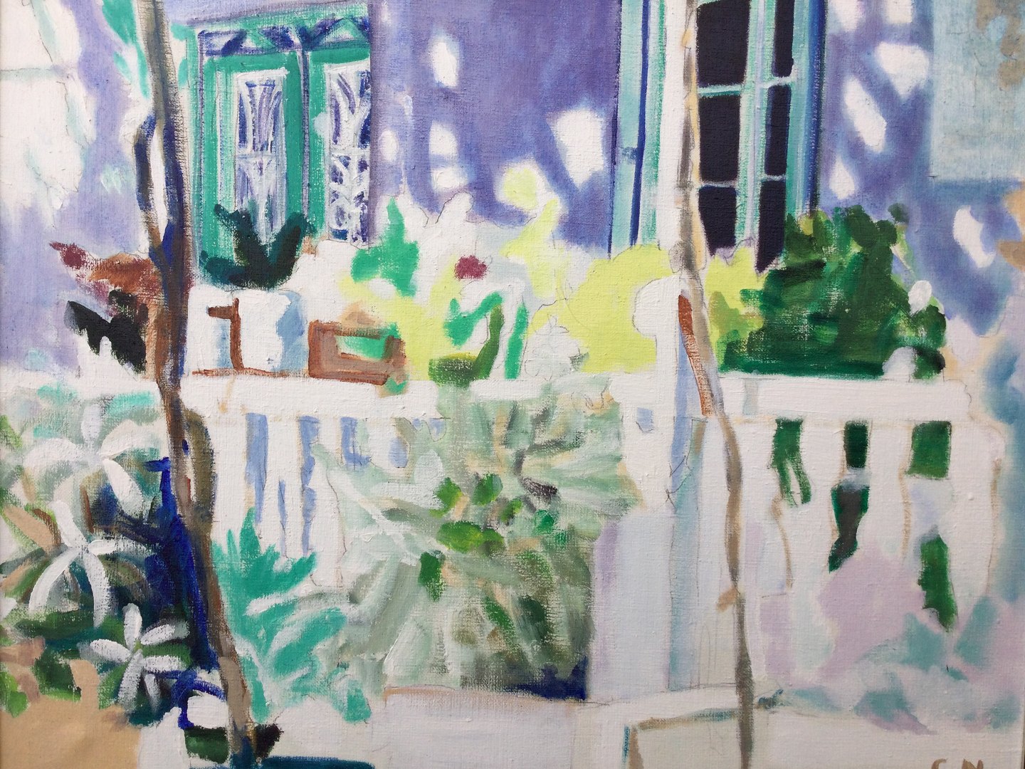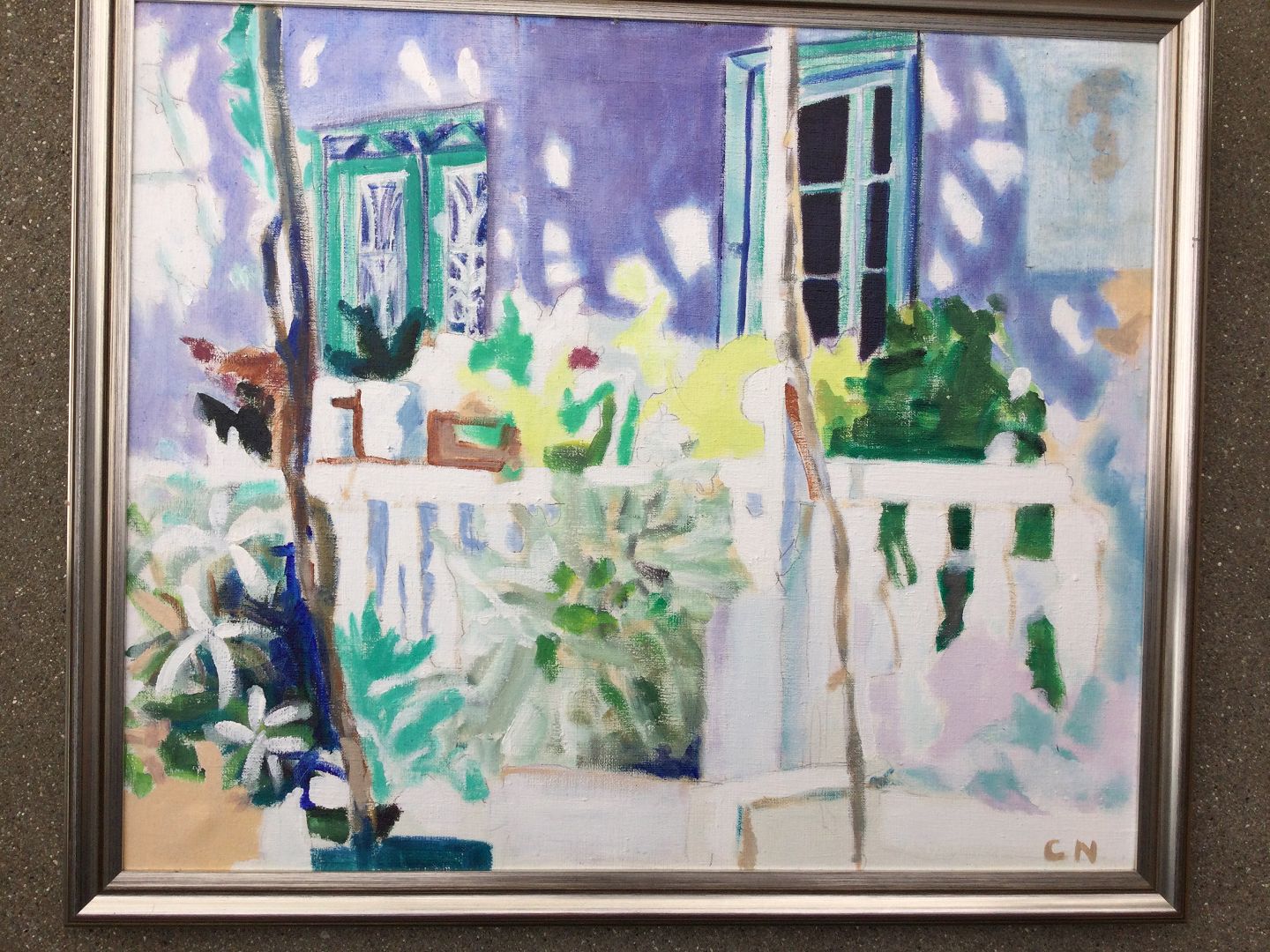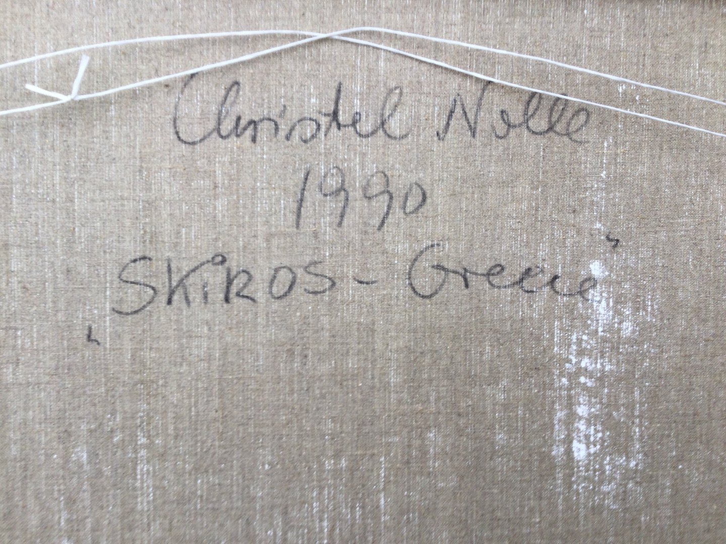 Maleri af Christel Nolle - Eksteriør ved hus på Skiros, Grækenland 1990.