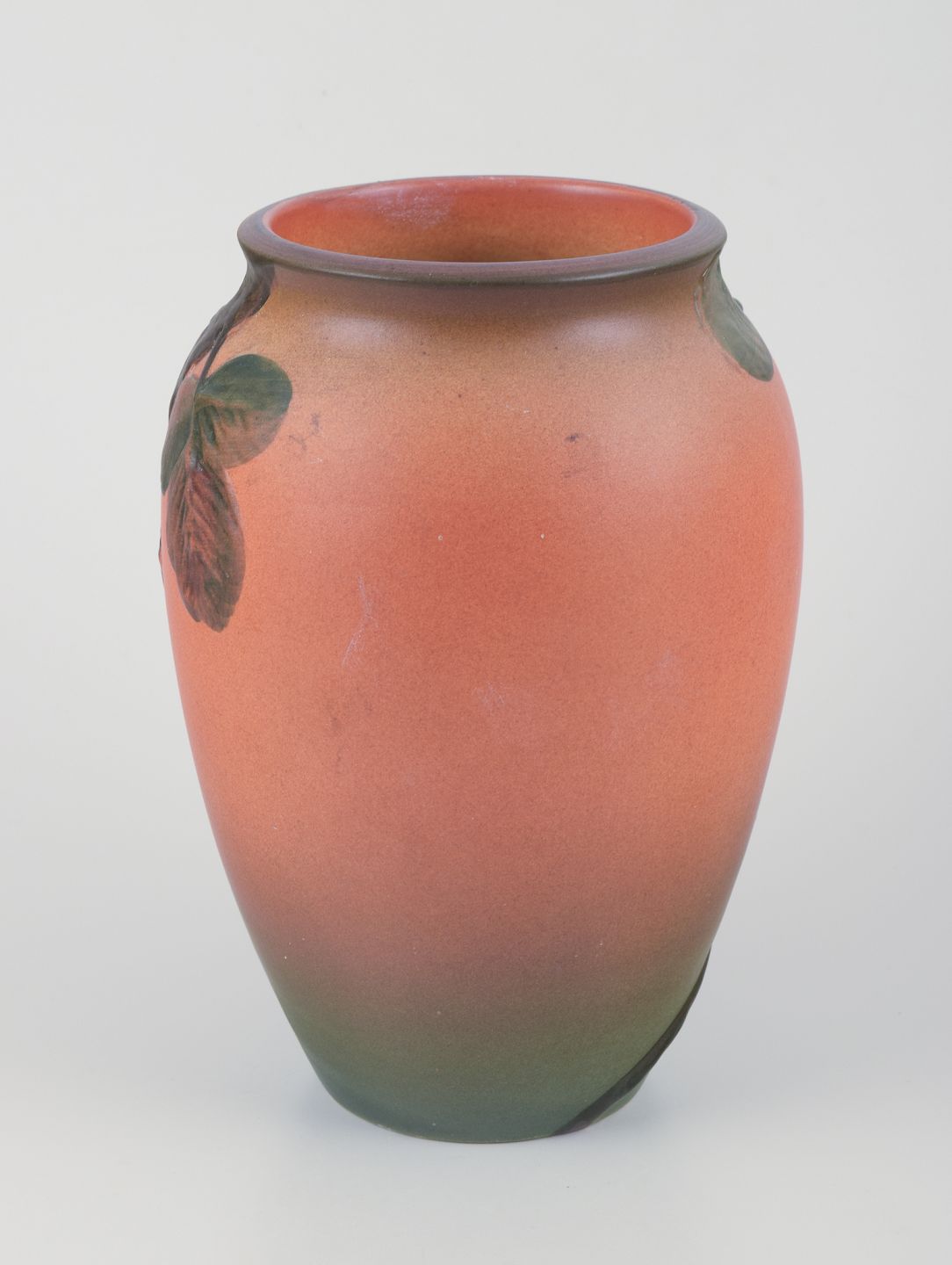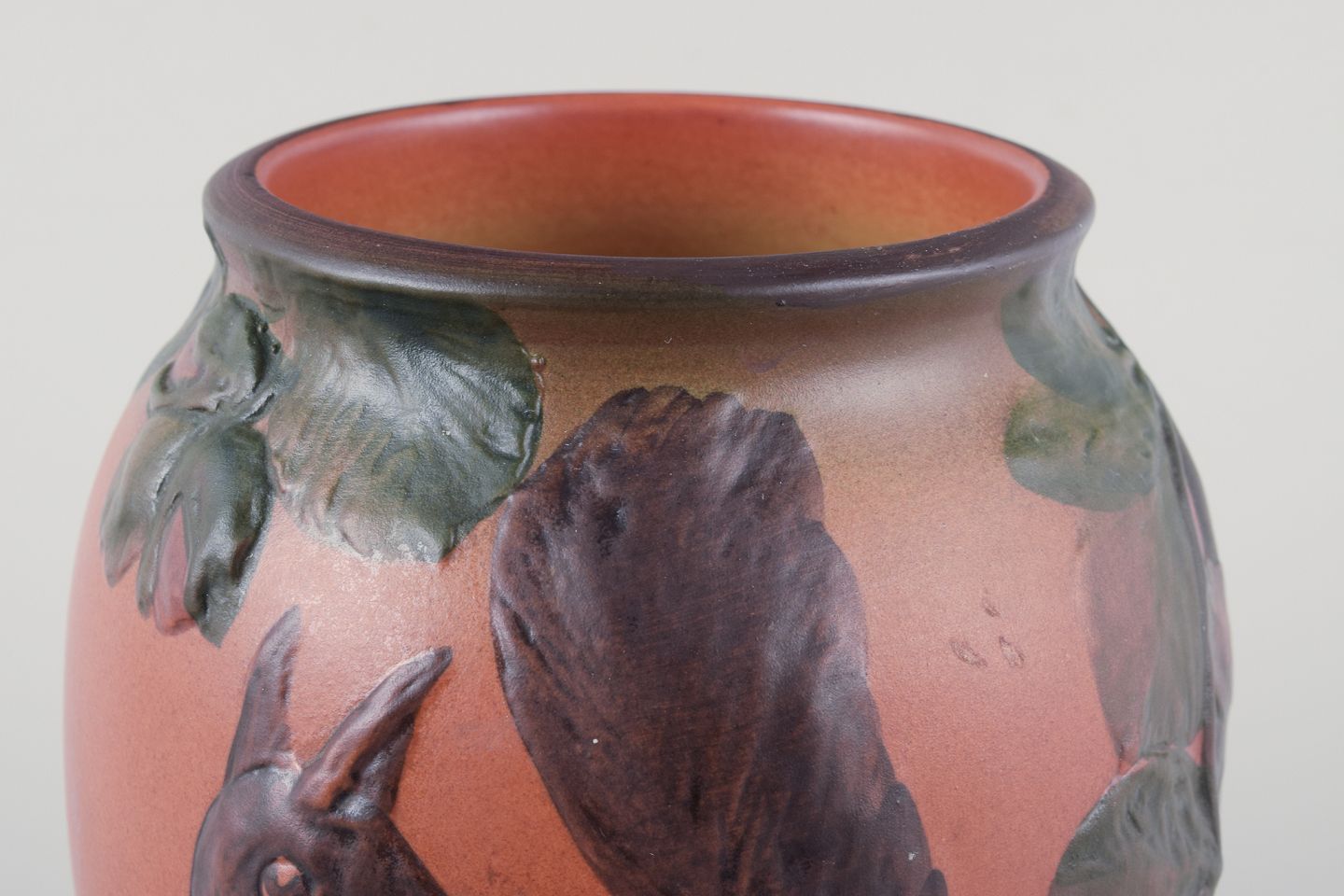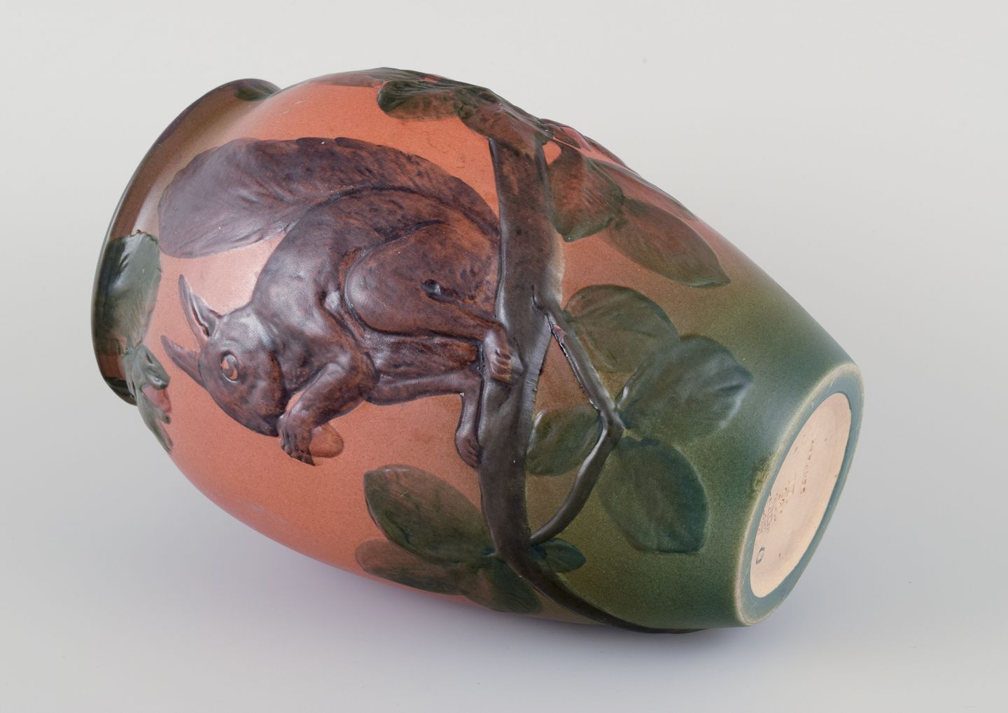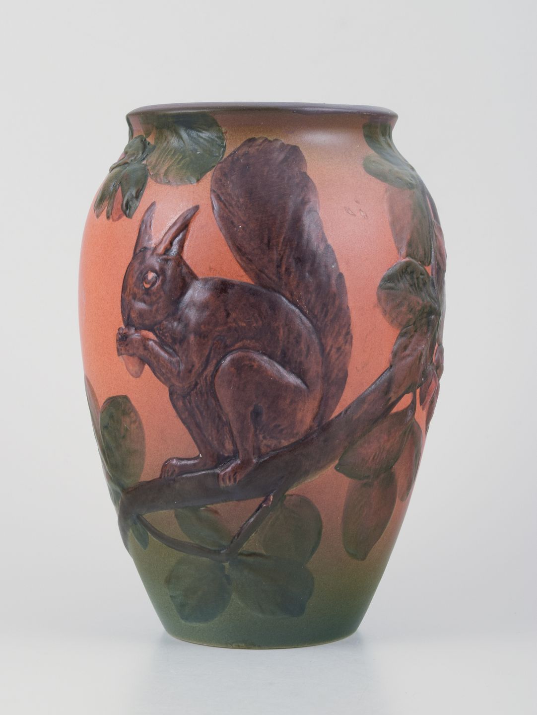 Ipsens Enke, keramikvase med egern, glasur i orange og grønne toner.
