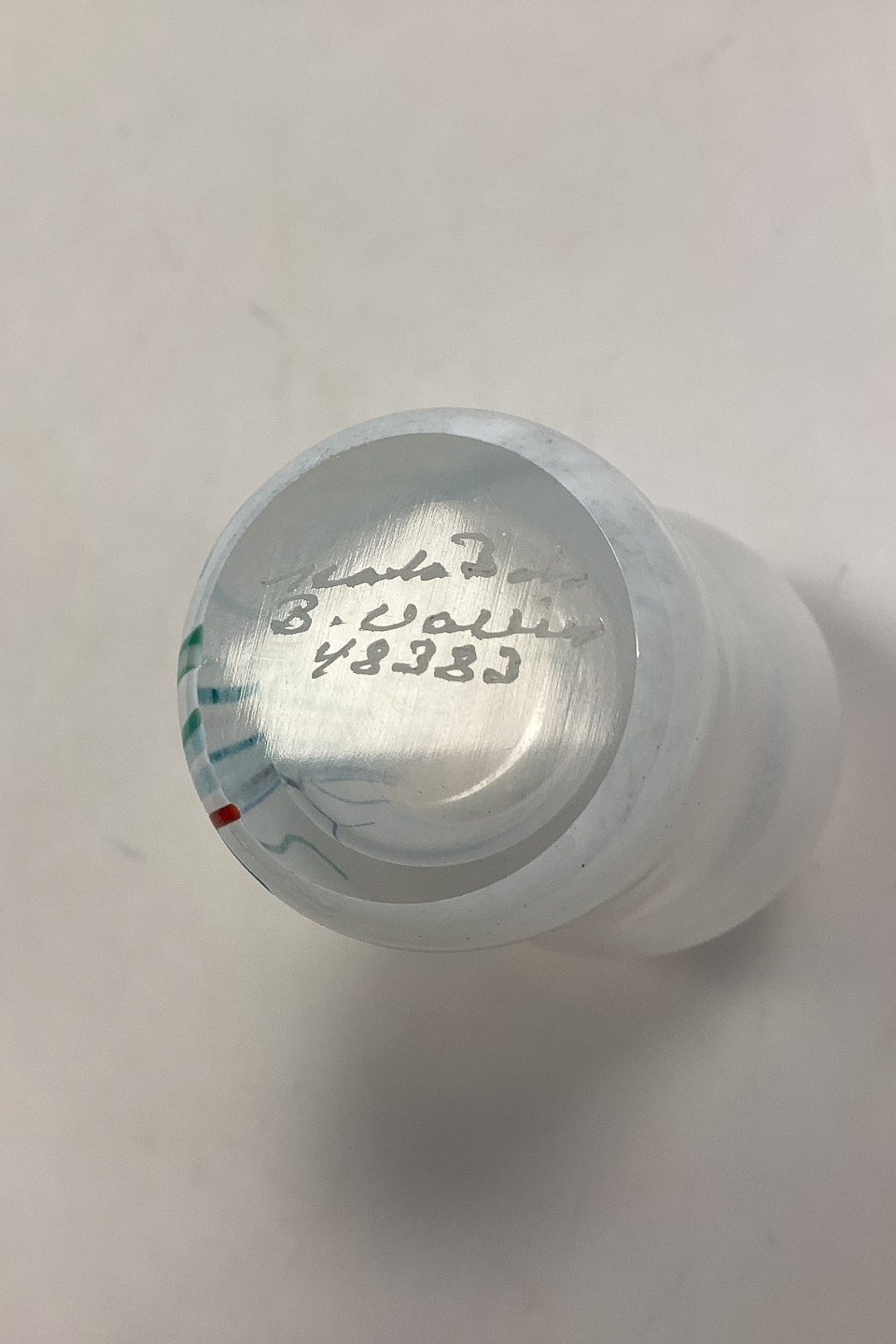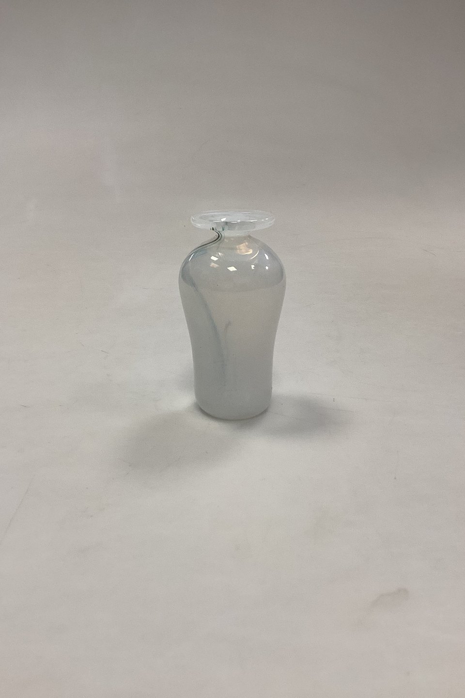 Kosta Boda Network Vase No. 48383. Designet af Bertil Vallien. Miniaturevase i mundblæst mælkehvidt glas med stribet farvedekoration. Signeret: Kosta Boda B. Vallien 48383.