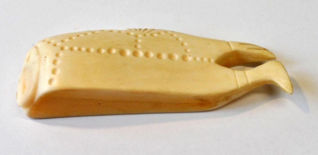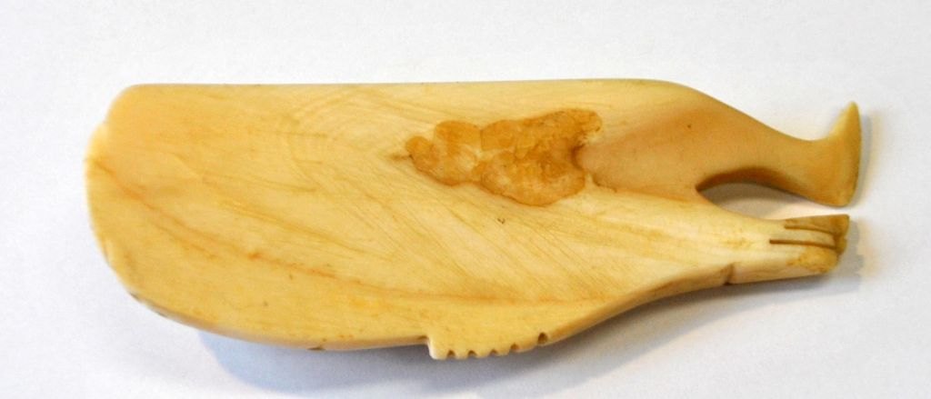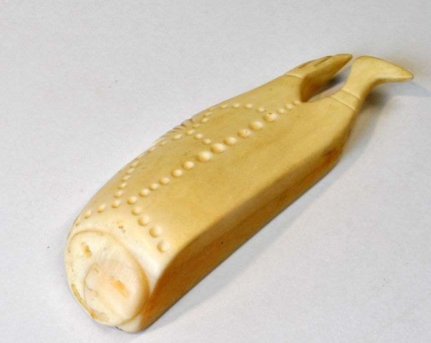 Grønlandsk tupilak af narhvalstand, 20. årh. Dekoreret som mand og sæl. L.: 11,5 cm.