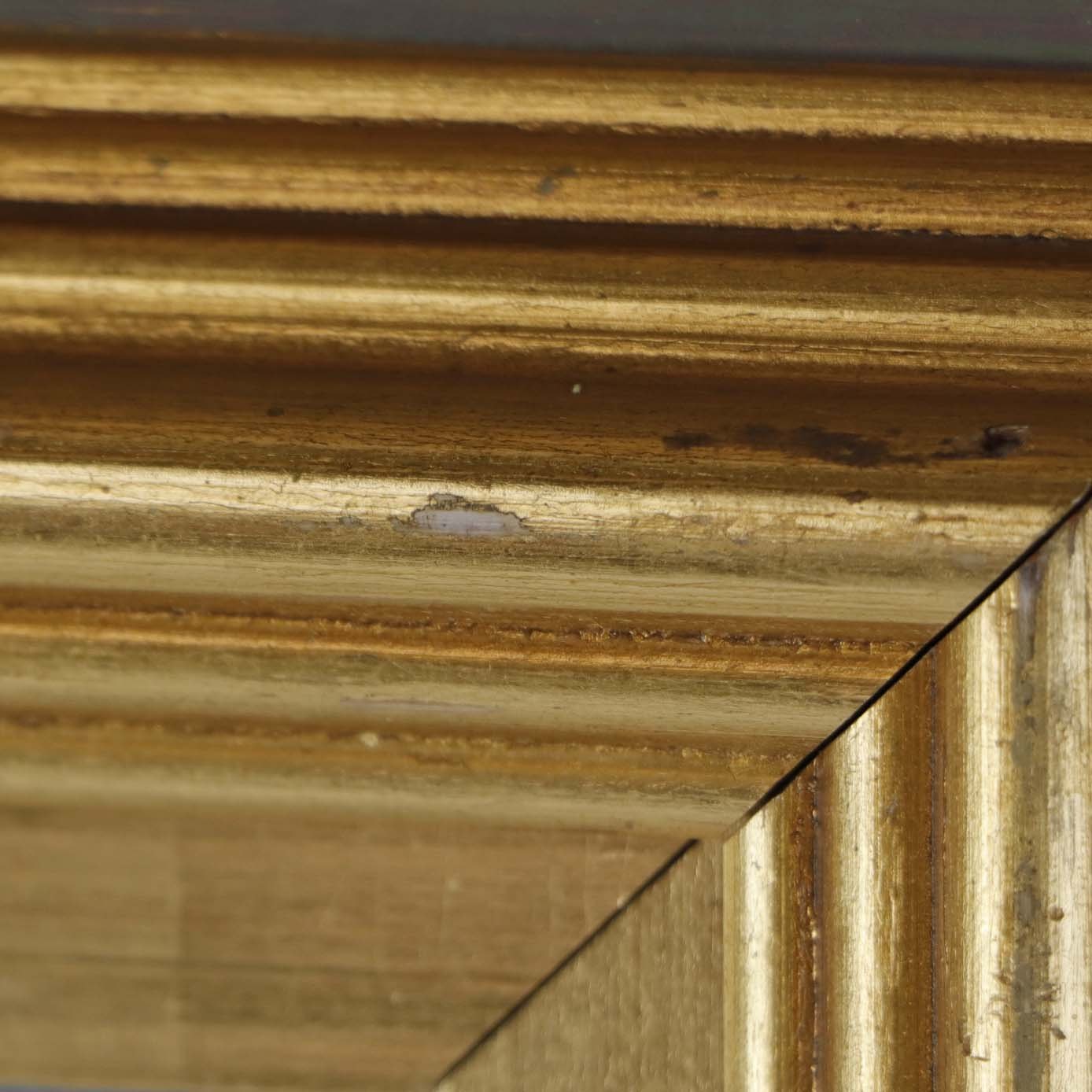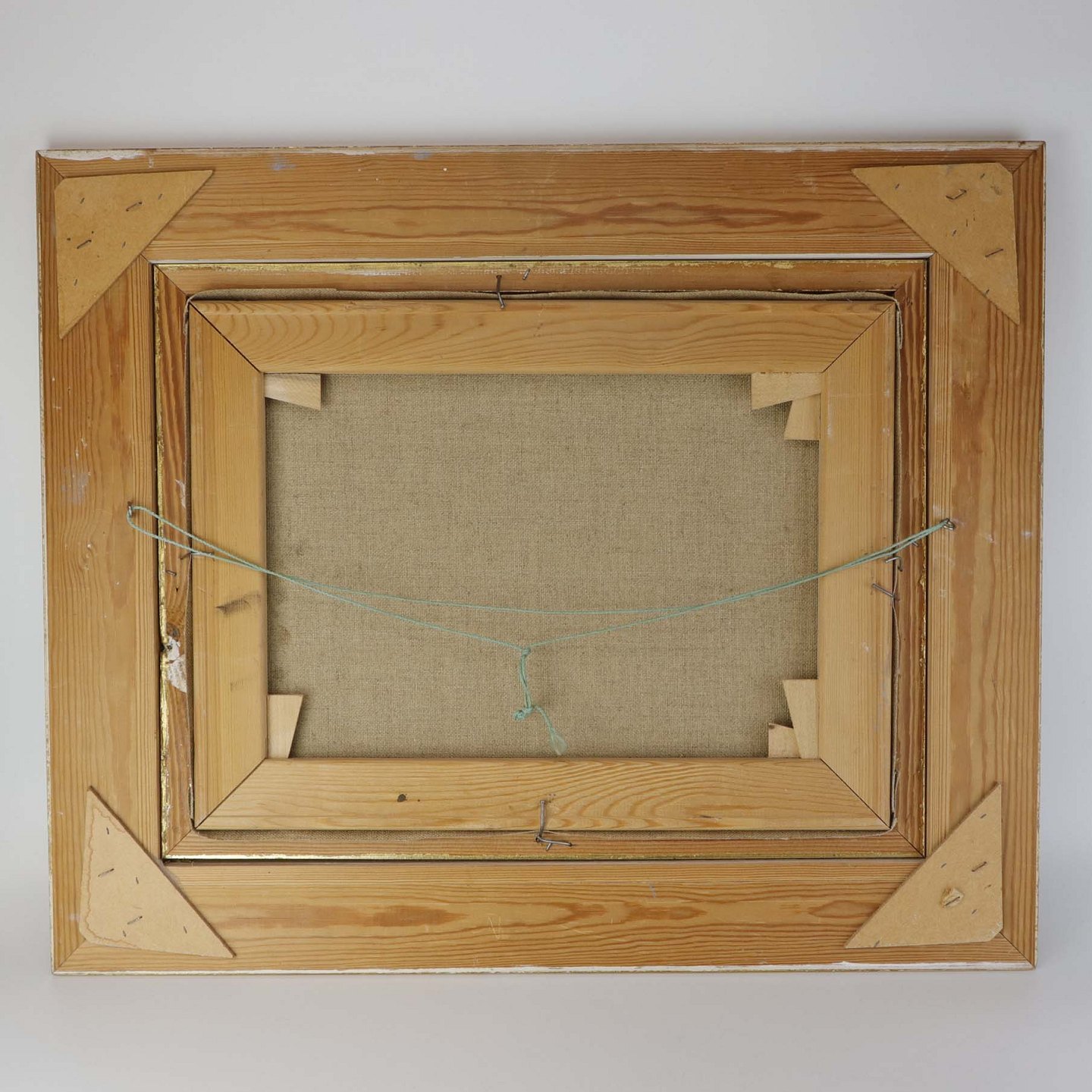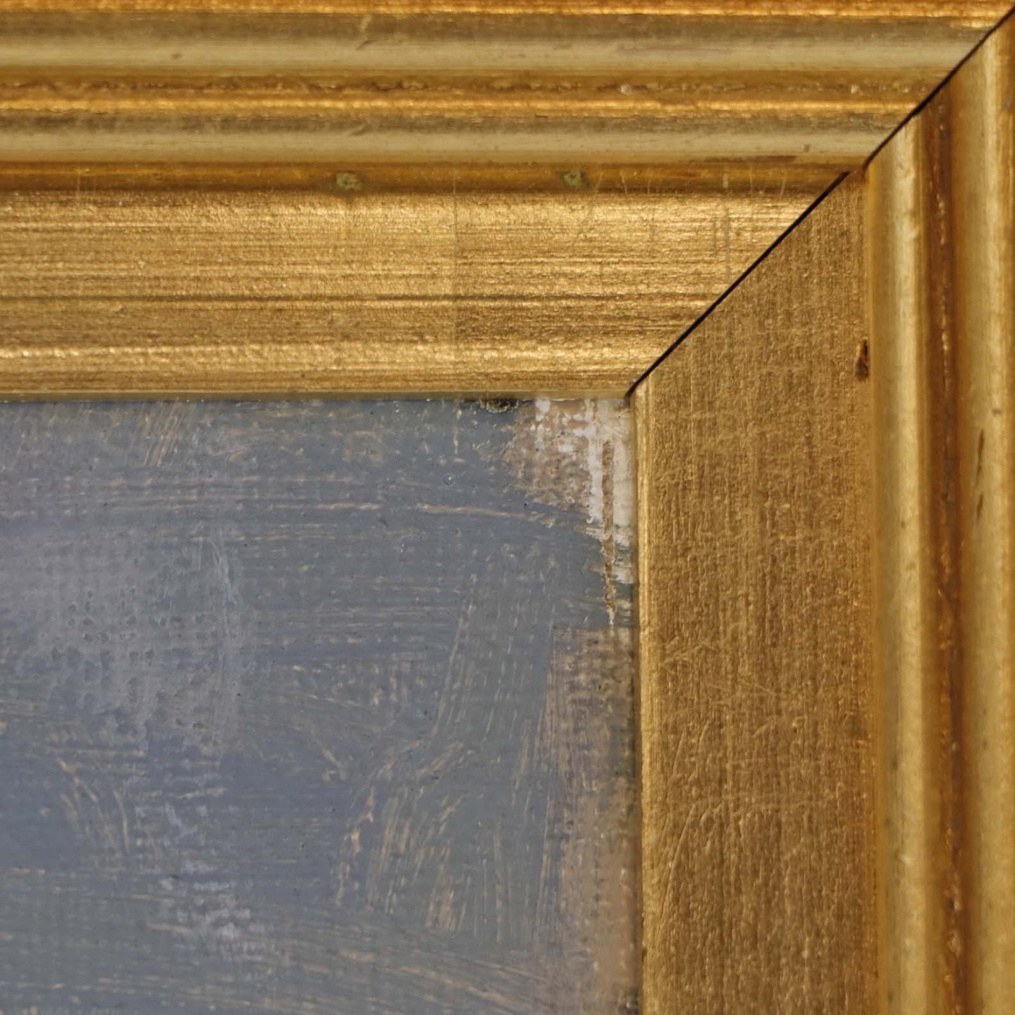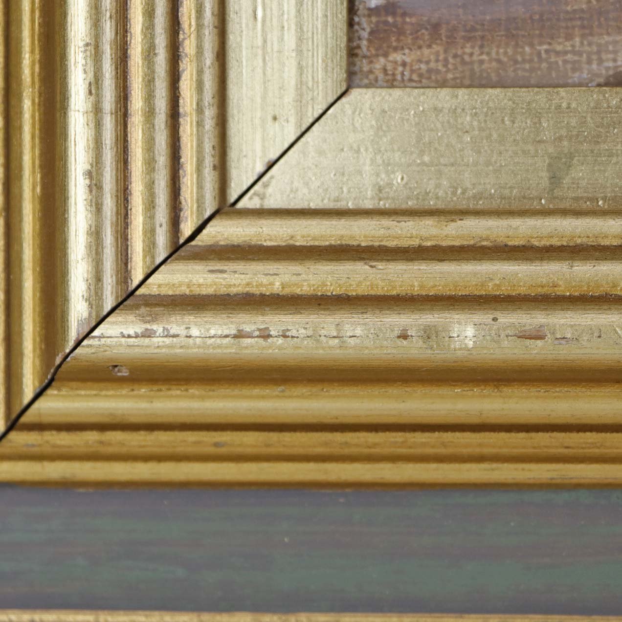 Oliemaleri på lærred i guldmalet træramme. Havmaleri med motiv af et stendige ved kysten.