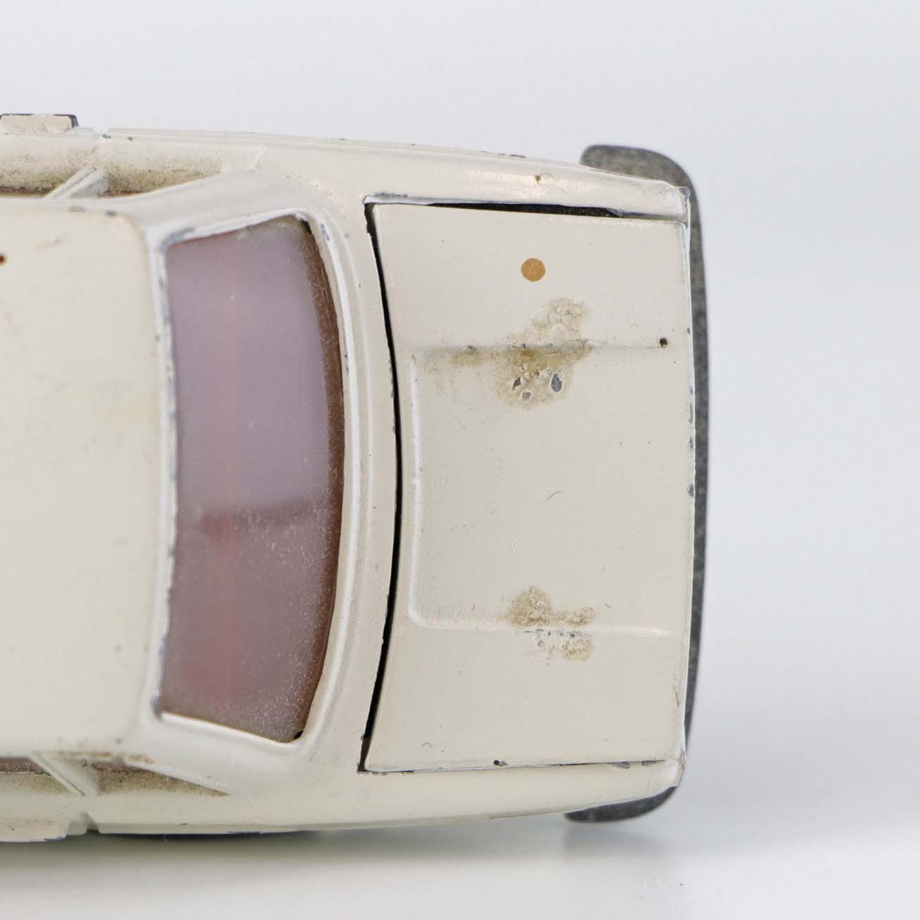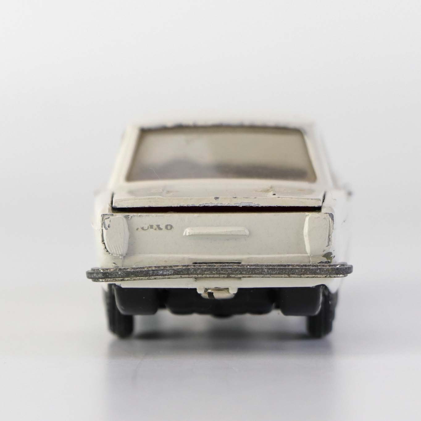 Hvid Volvo 144 legetøjsbil i lakeret metal med gummi hjul. Modelbilens døre, bagklap og motorhjelm kan åbnes.