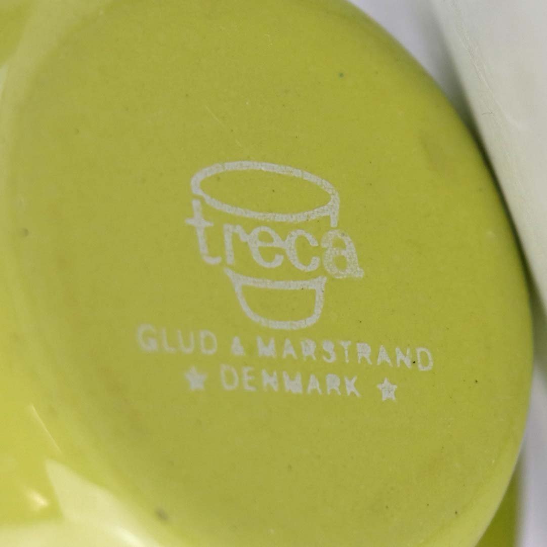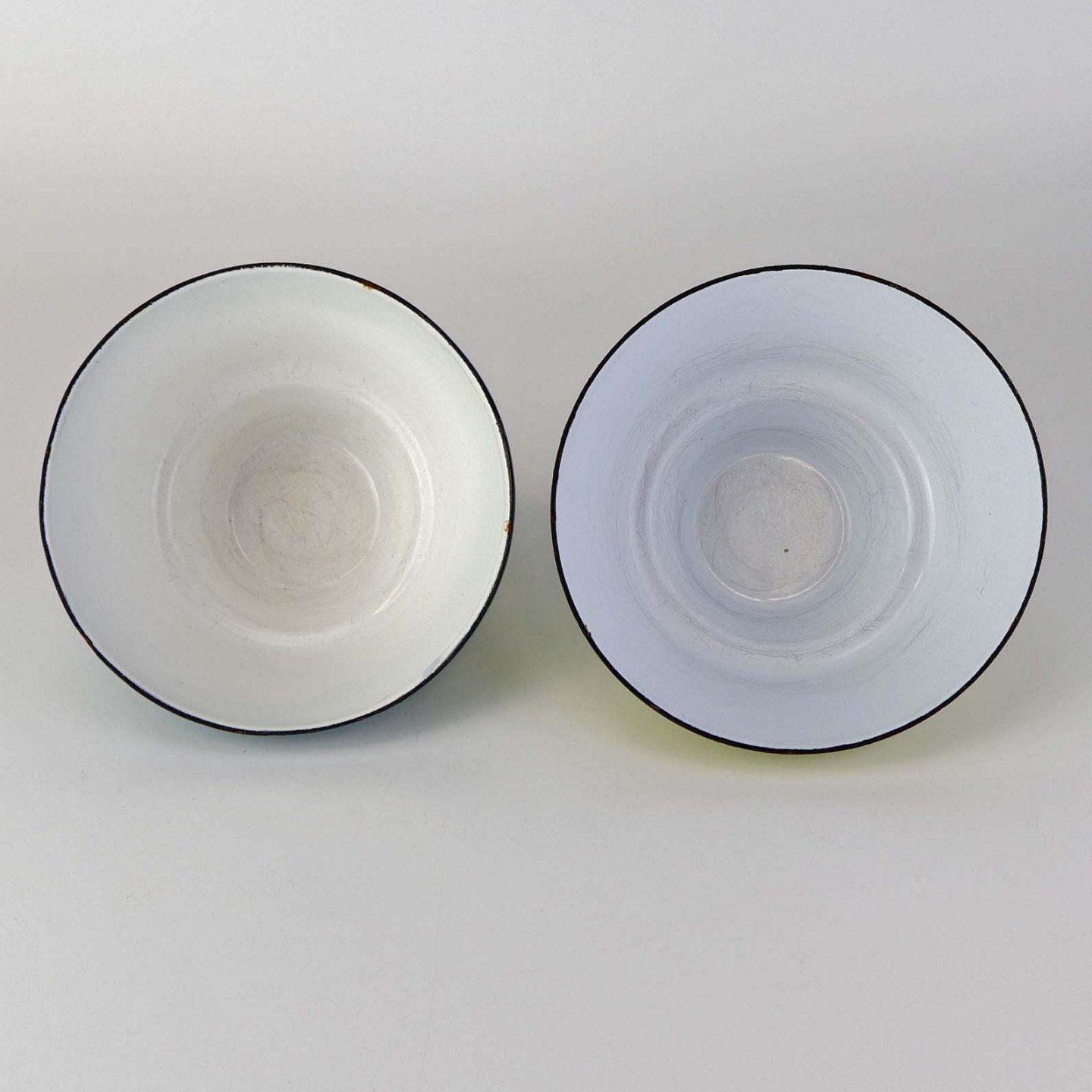 Et sæt med to mindre skåle i blå og limegrøn emalje med hvid emalje på indersiden. Model Treca
