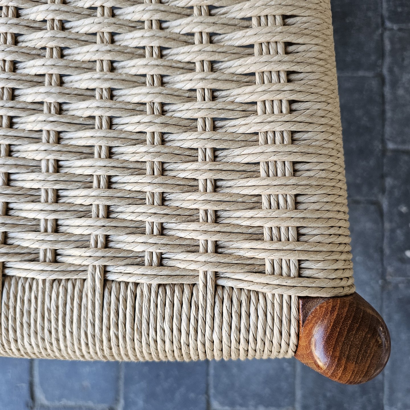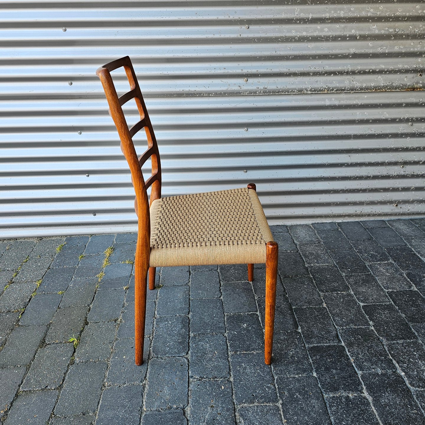 Sæt med seks styk spisebordsstole model 82 i teaktræ med ny flettede sæder, og nyrenoverede