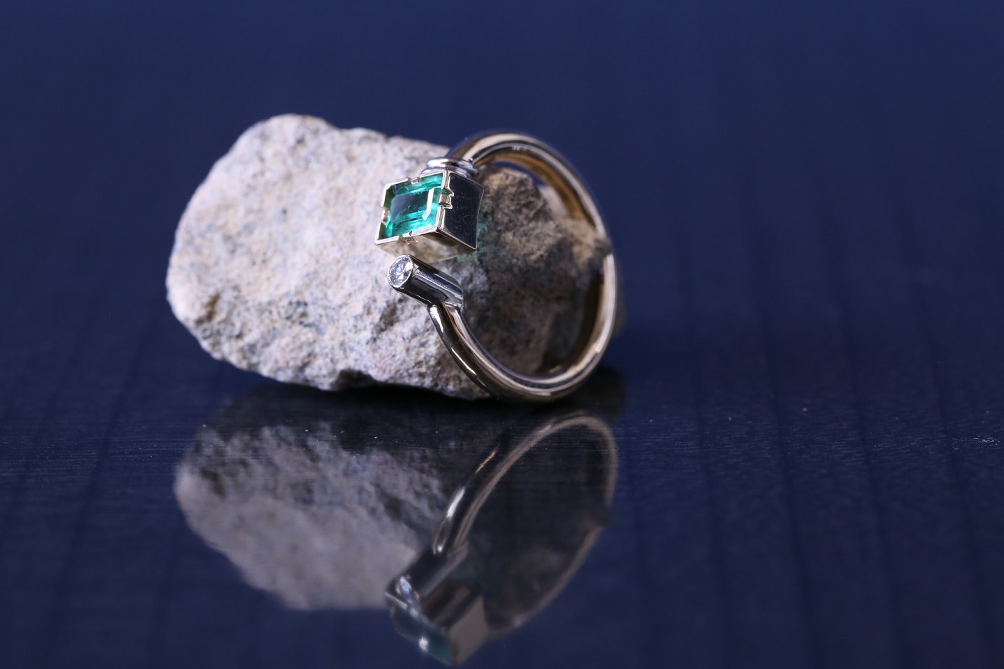 Smuk og stilren guldring i 14 karat guld, med flot facetslebet smaragd og lille diamant. Dynamikken mellem smaragden og diamant, giver ringen liv.
