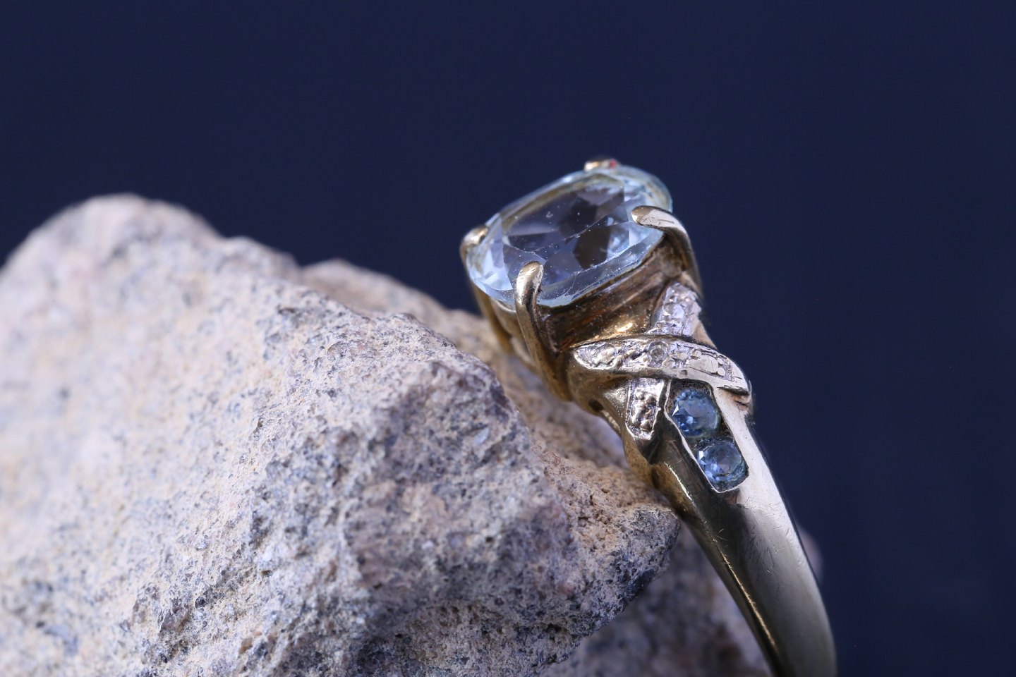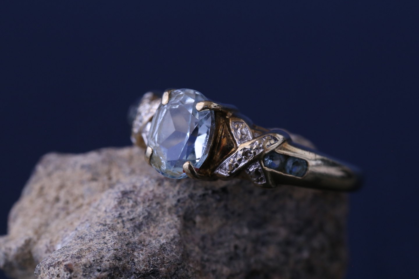 Ladies' ring 14 carat gold, with inlaid light blue aquamarines. Stamped DIA. Ring size 56.