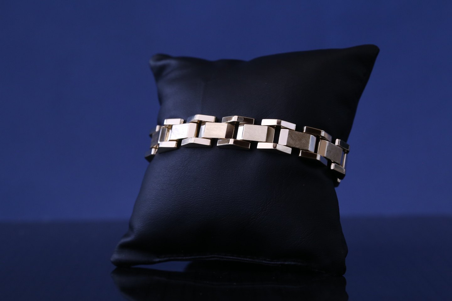 Smukt Blok guldarmbånd med 3 rækker og ciseleringer i midterste række. Dette giver armbåndet en stor kontrast og dynamik. Derfor er armbåndet et meget smukt smykke, der især kan bruges ved festlige lejligheder.