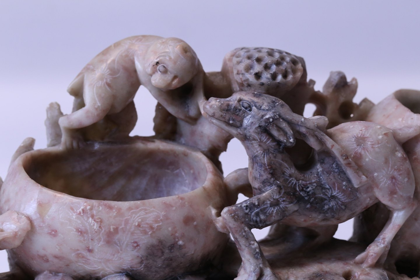 Bordskulptur af fedtsten med flot detaljeret dyremotiv, samt to rum.