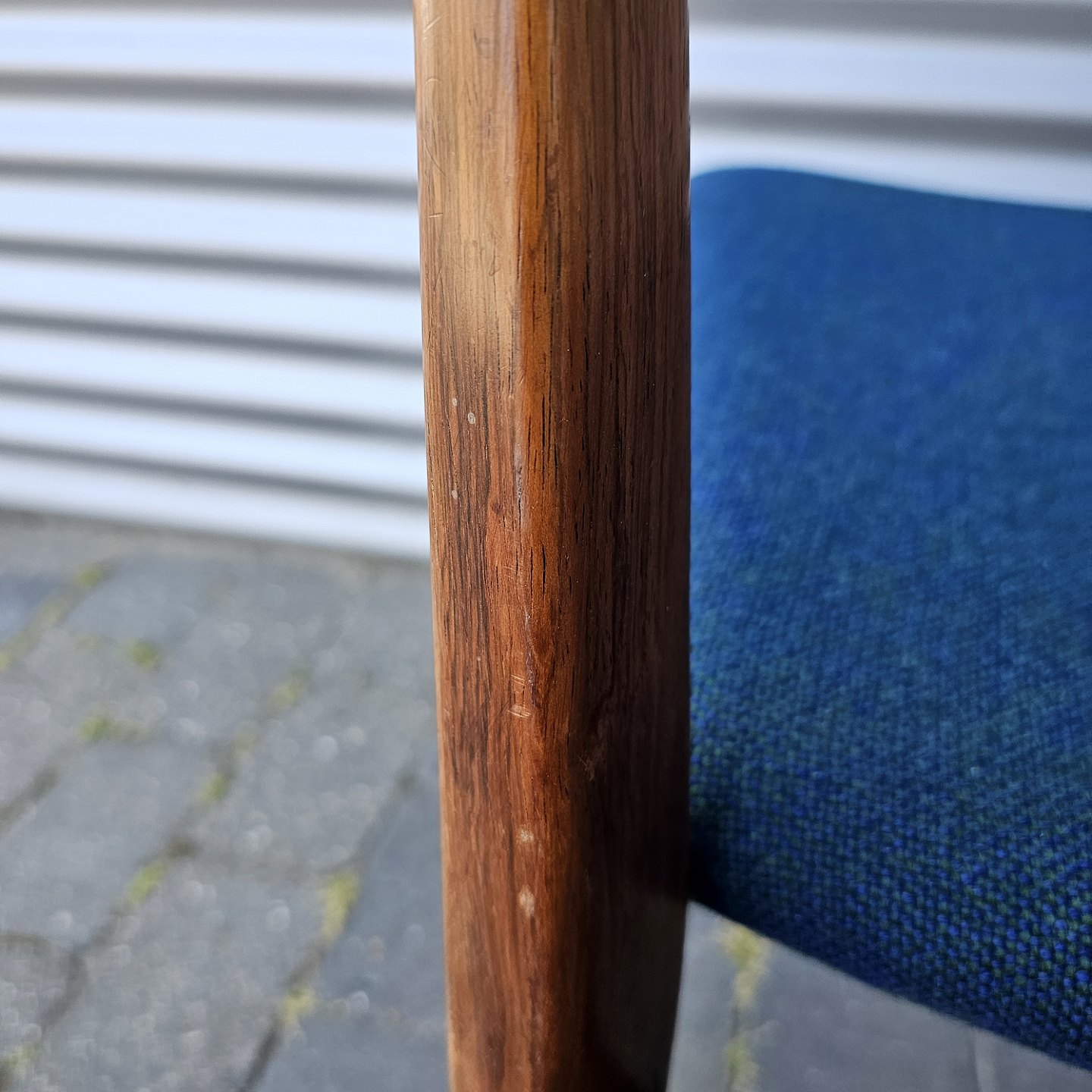 Sæt med fire spisebordsstole i palisander med sæde betrukket med blåt stof