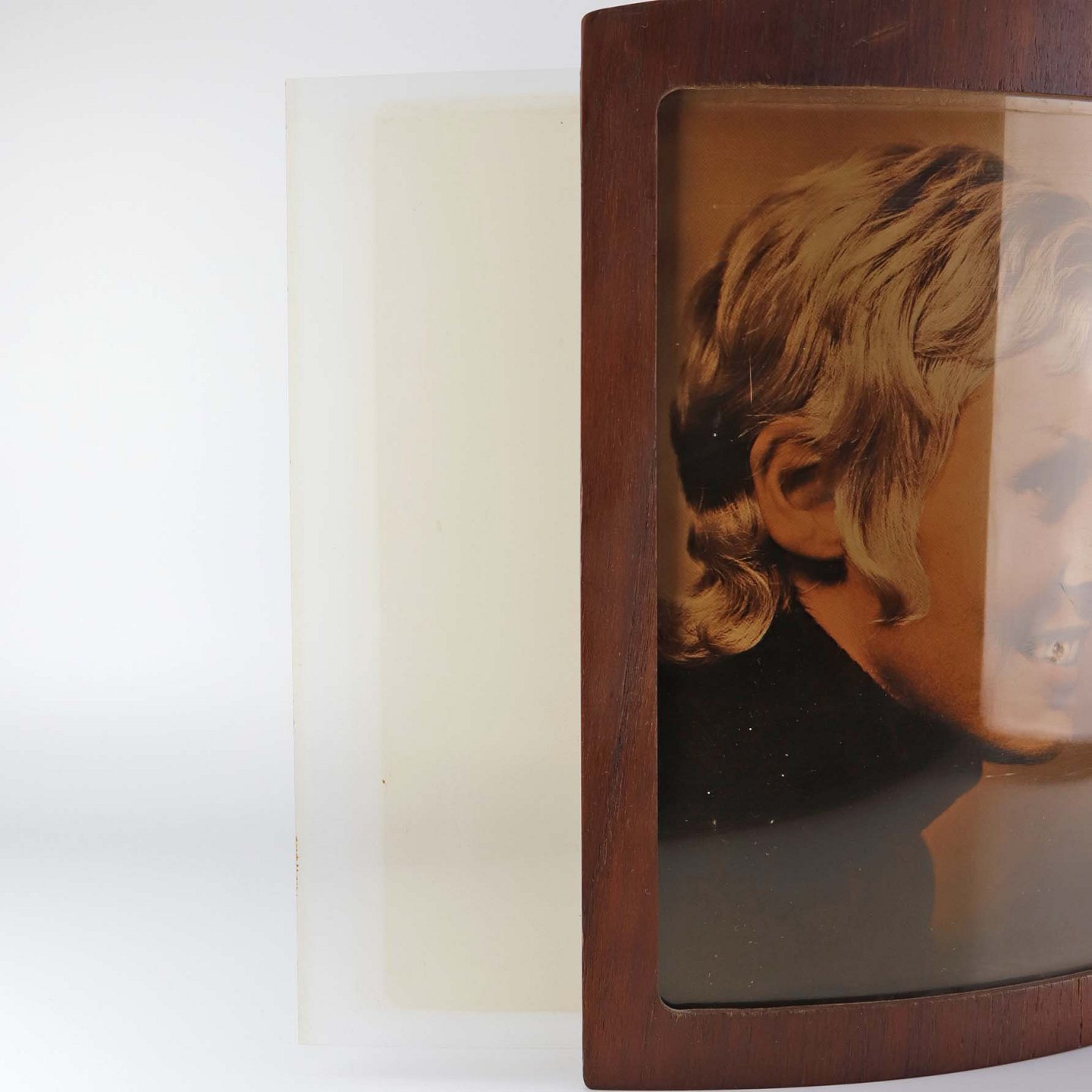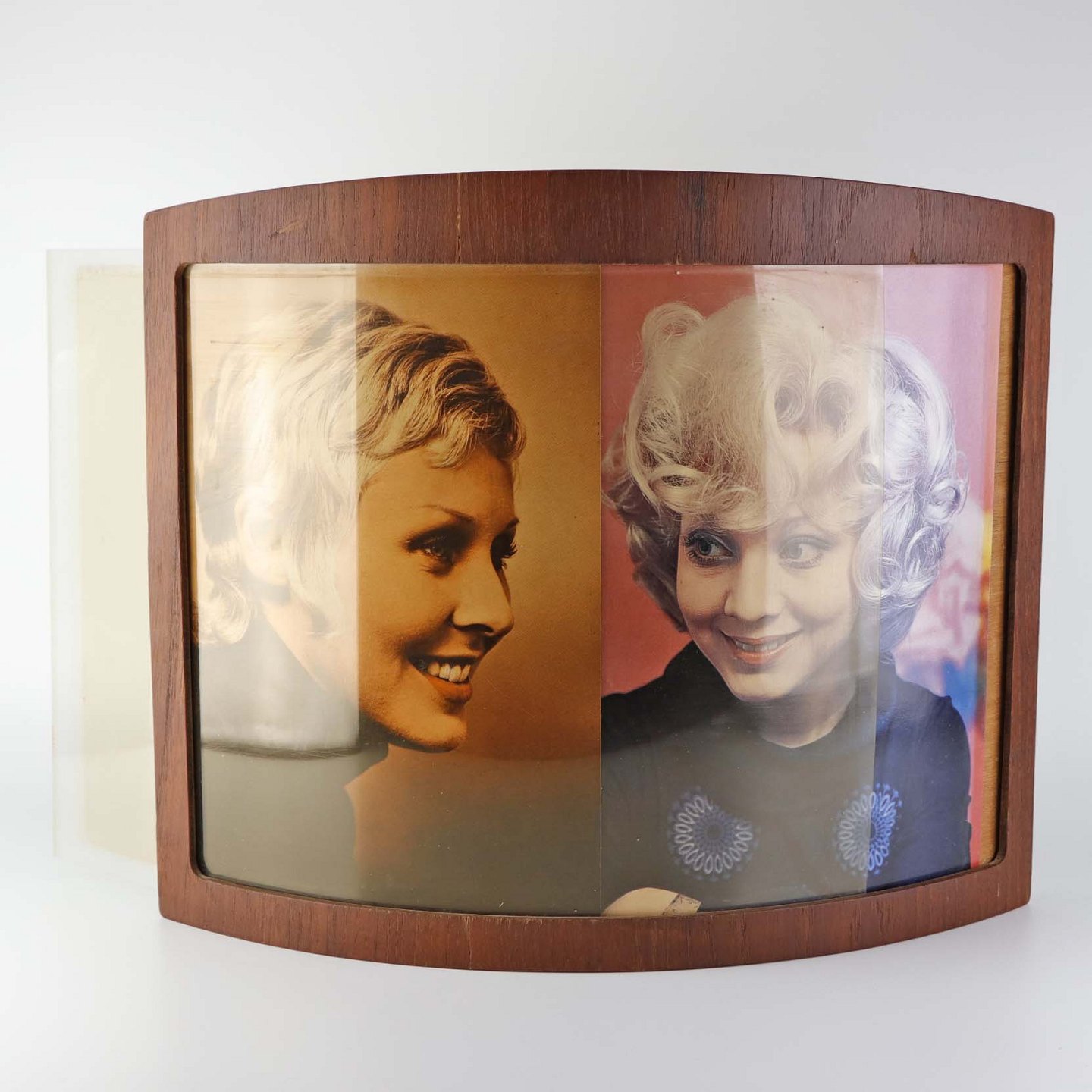 Indrammet tryk bag blødt past i buet ramme i teaktræsfiner. Trykket er med motiv fra frisørsalon.