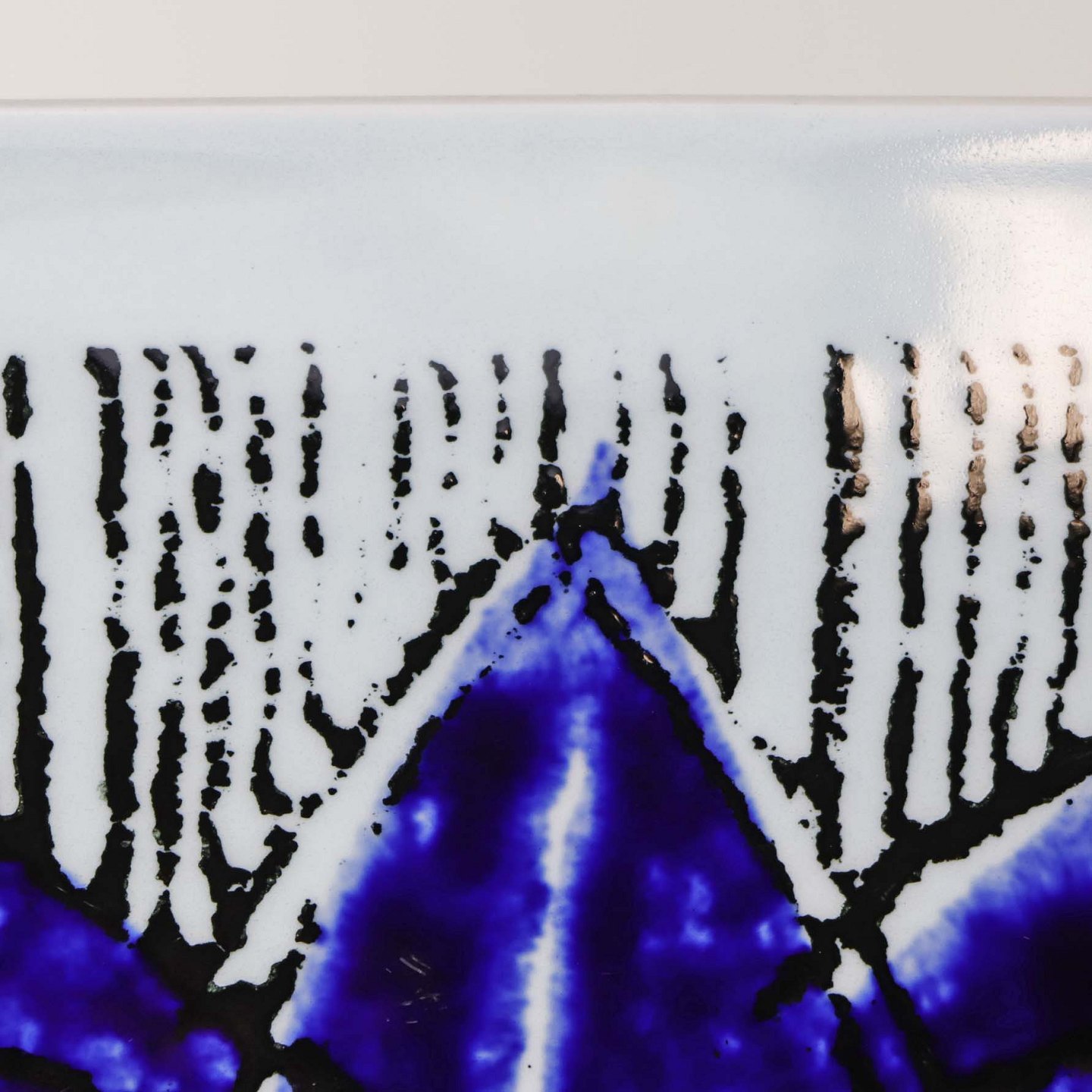 Kvadratisk relief i glaseret porcelæn med naturmotiv af blå blomster og blade på lyseblå baggrund.
