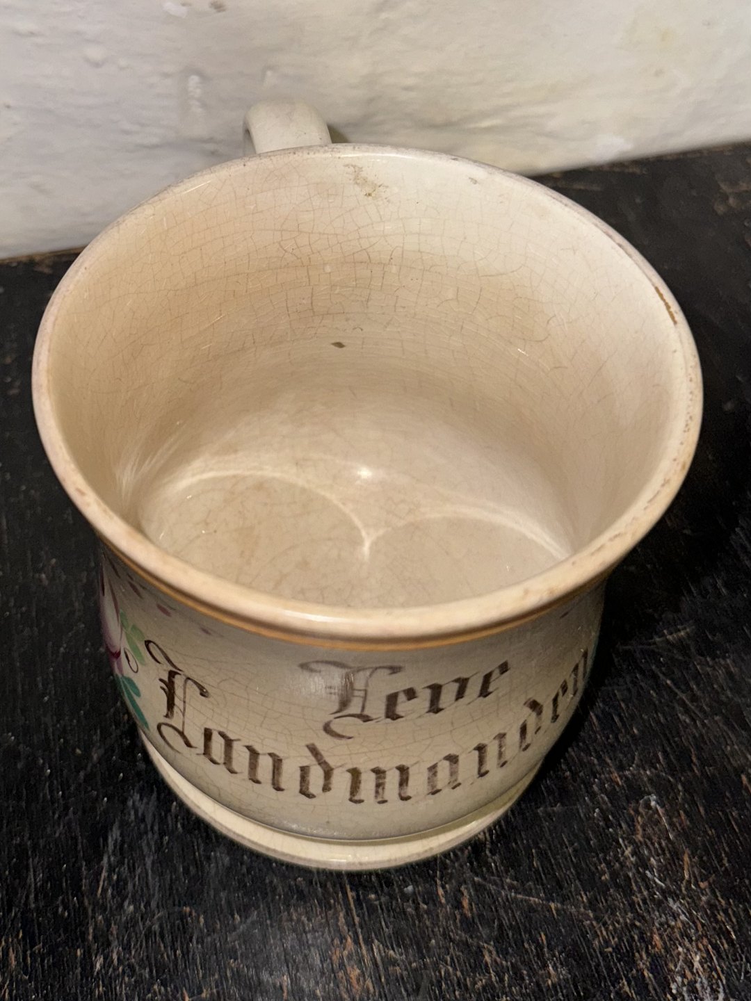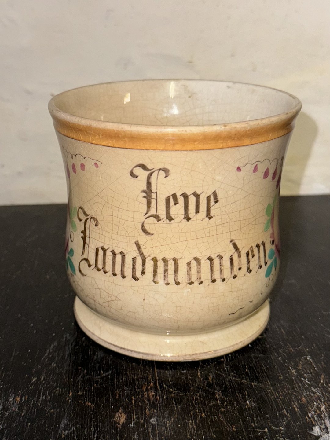 Ældre Aluminia krus i fajance med hank. Håndmalede blomster samt “Leve Landmanden” Fabriksstemplet (utydeligt) på bunden. Almindeligt brugsslid og krakkeleringer. Ingen skader eller reparationer. Mål: 11,5 cm højt