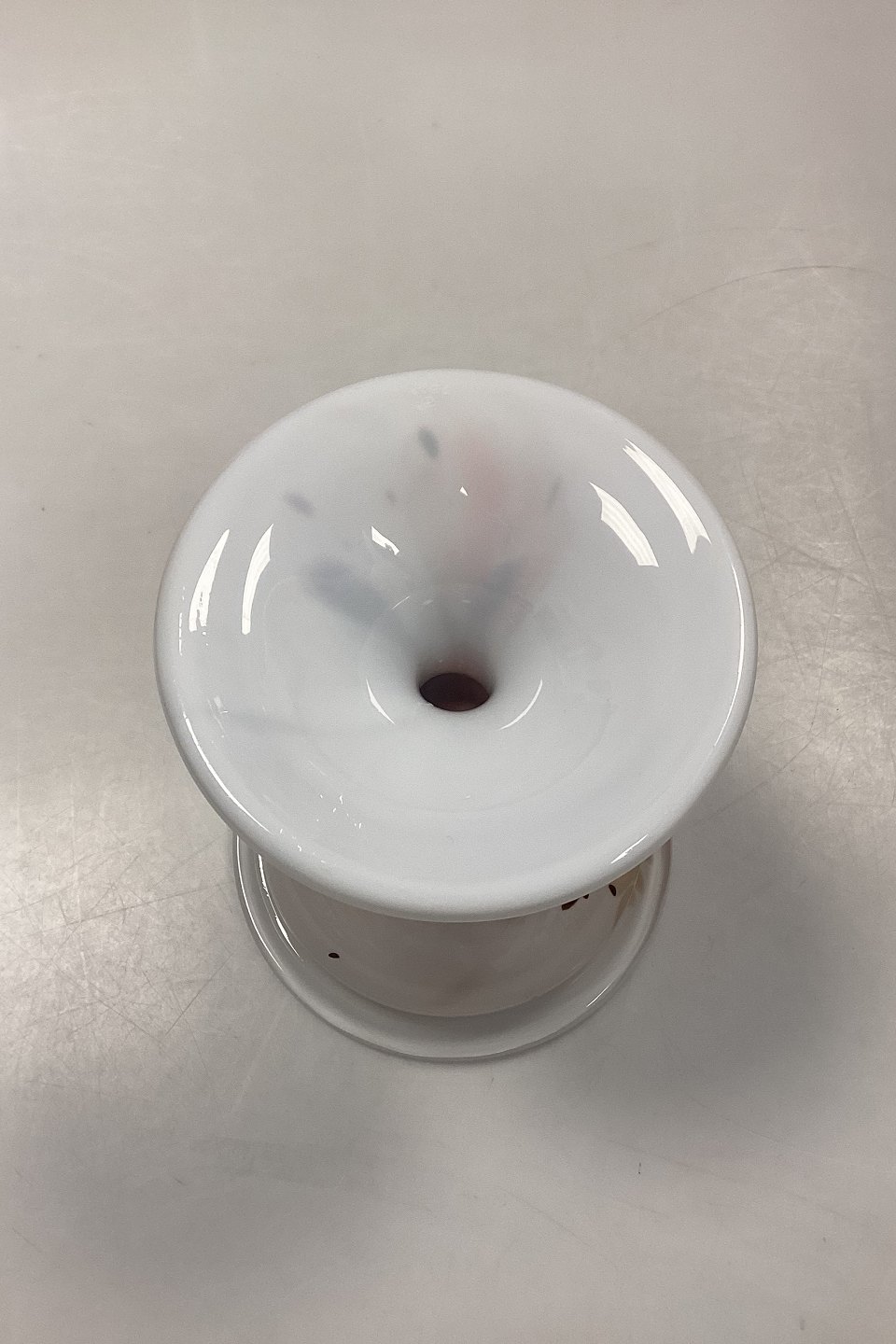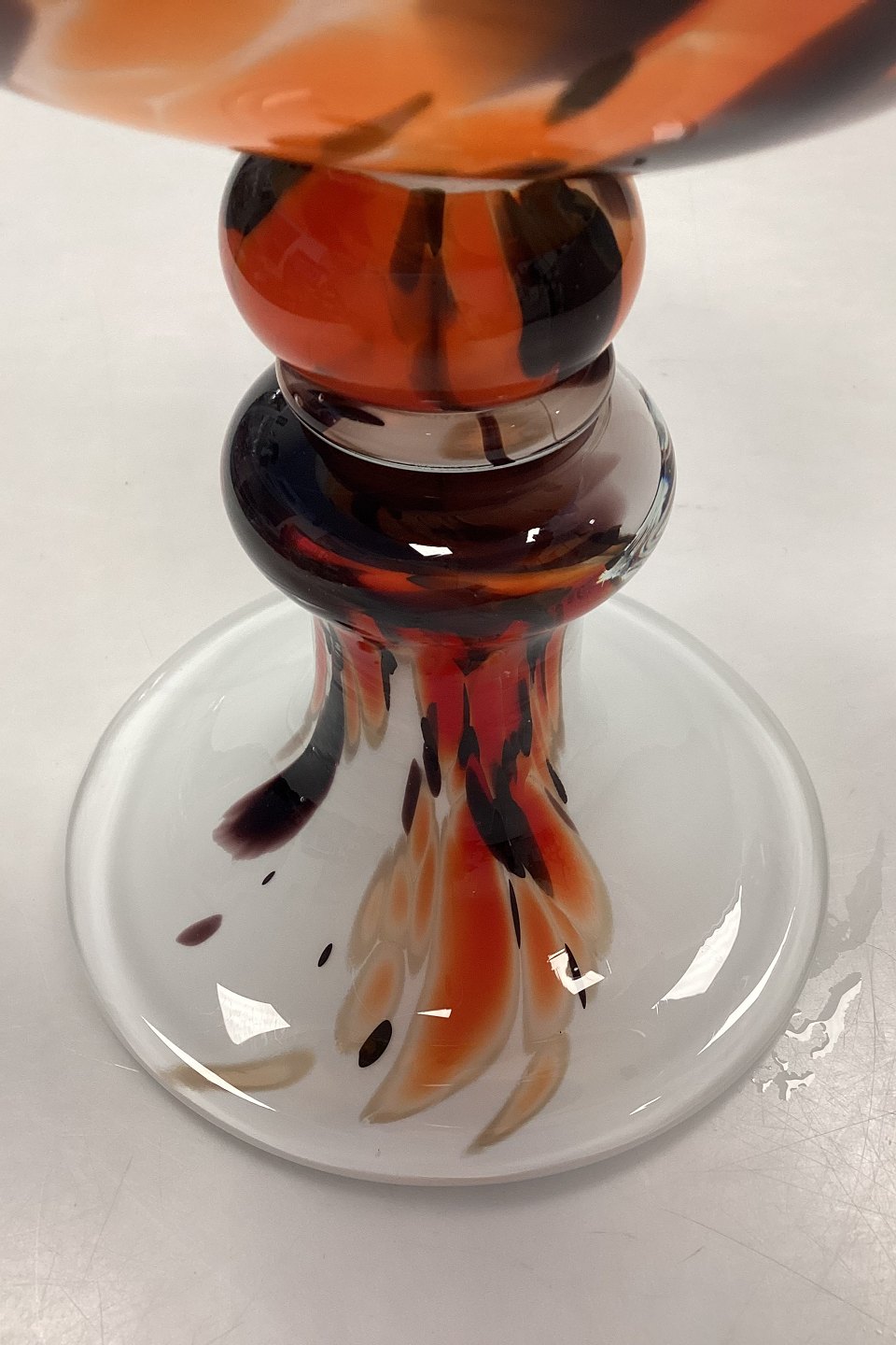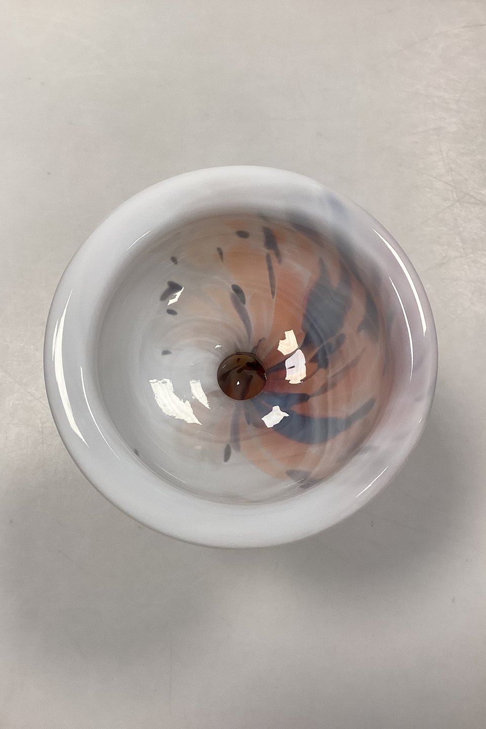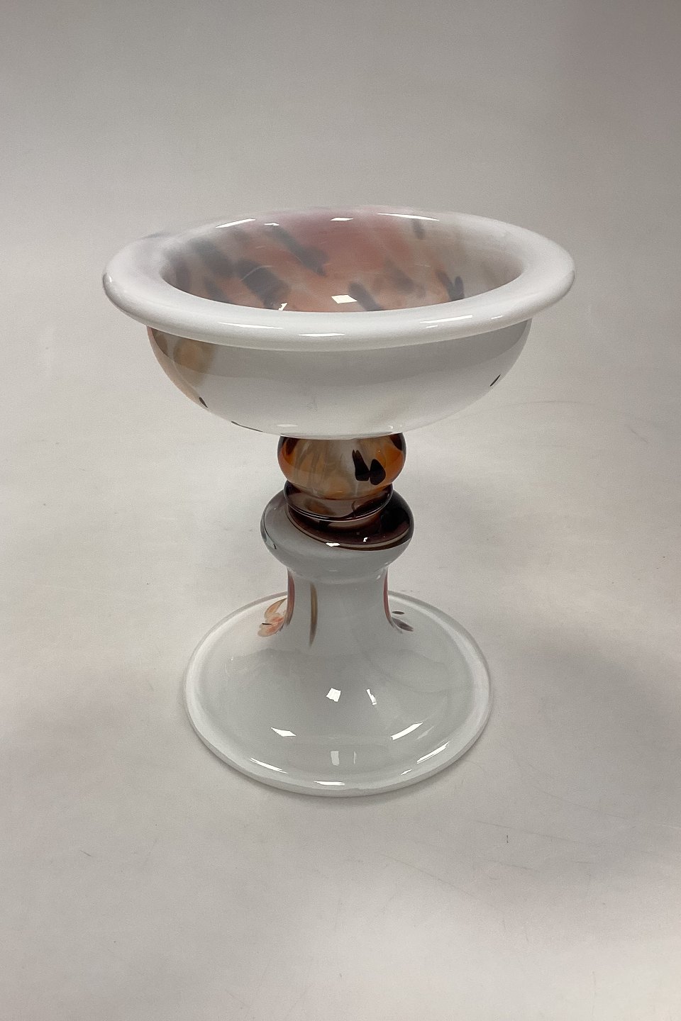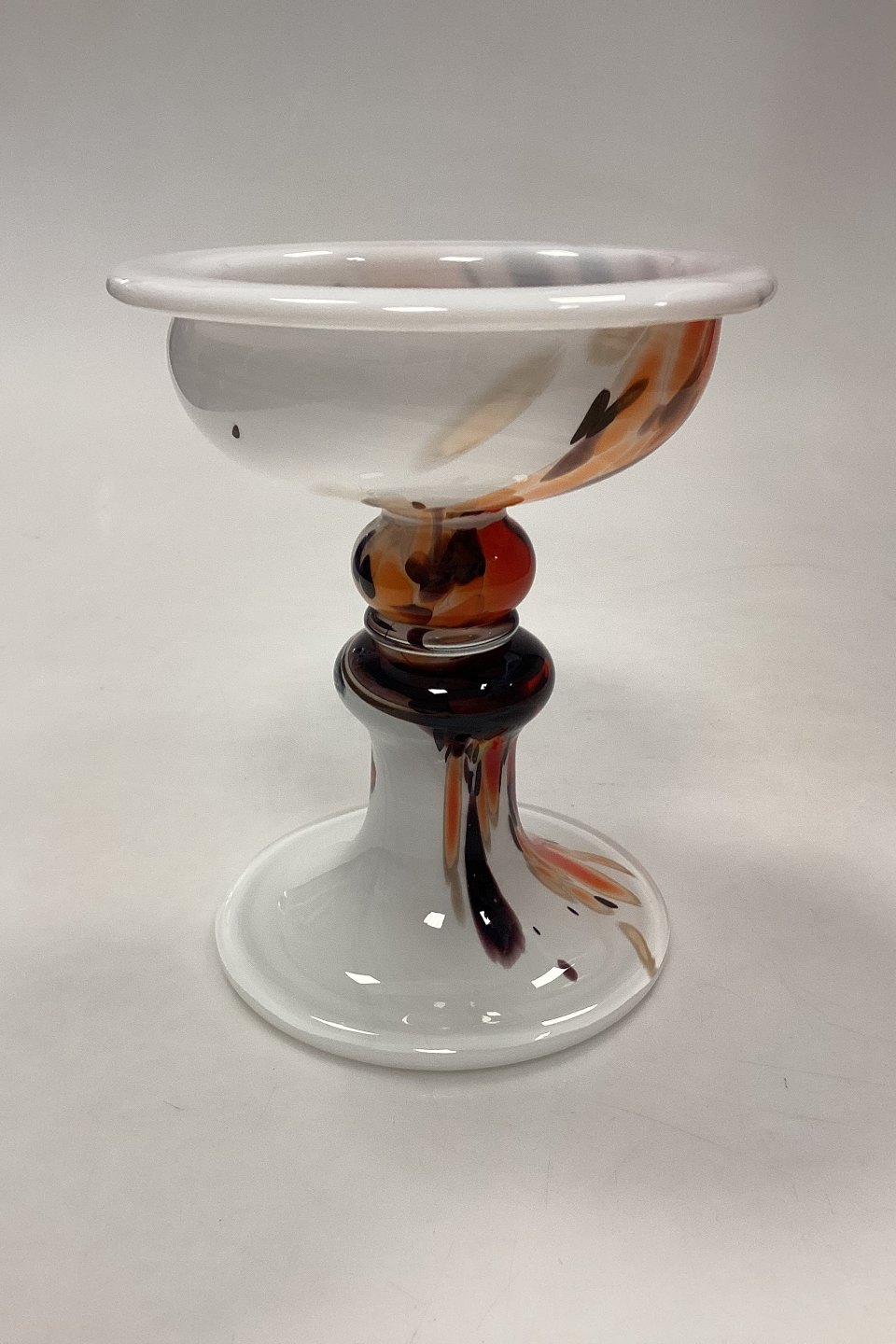 Holmegaard Cascade Glasskål / Lysestage. Designet af Per Lütken. Skålen er opalhvid, med multifarvede orange, sorte, og beige toner. Signeret HG6 PL.
