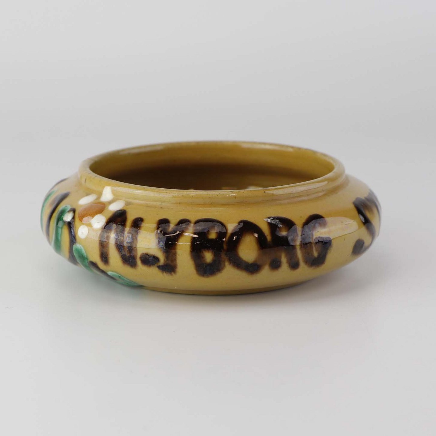 Mindre skål i glaseret keramik med teksten Nyborg Strand og dekoration af blomster og blade.