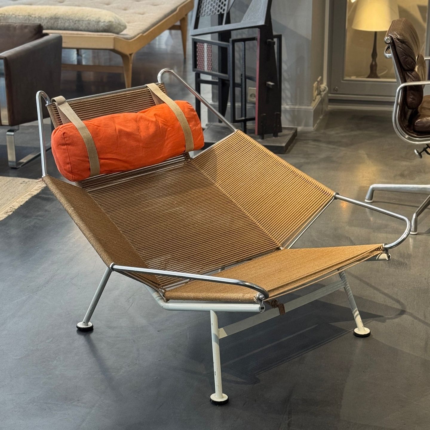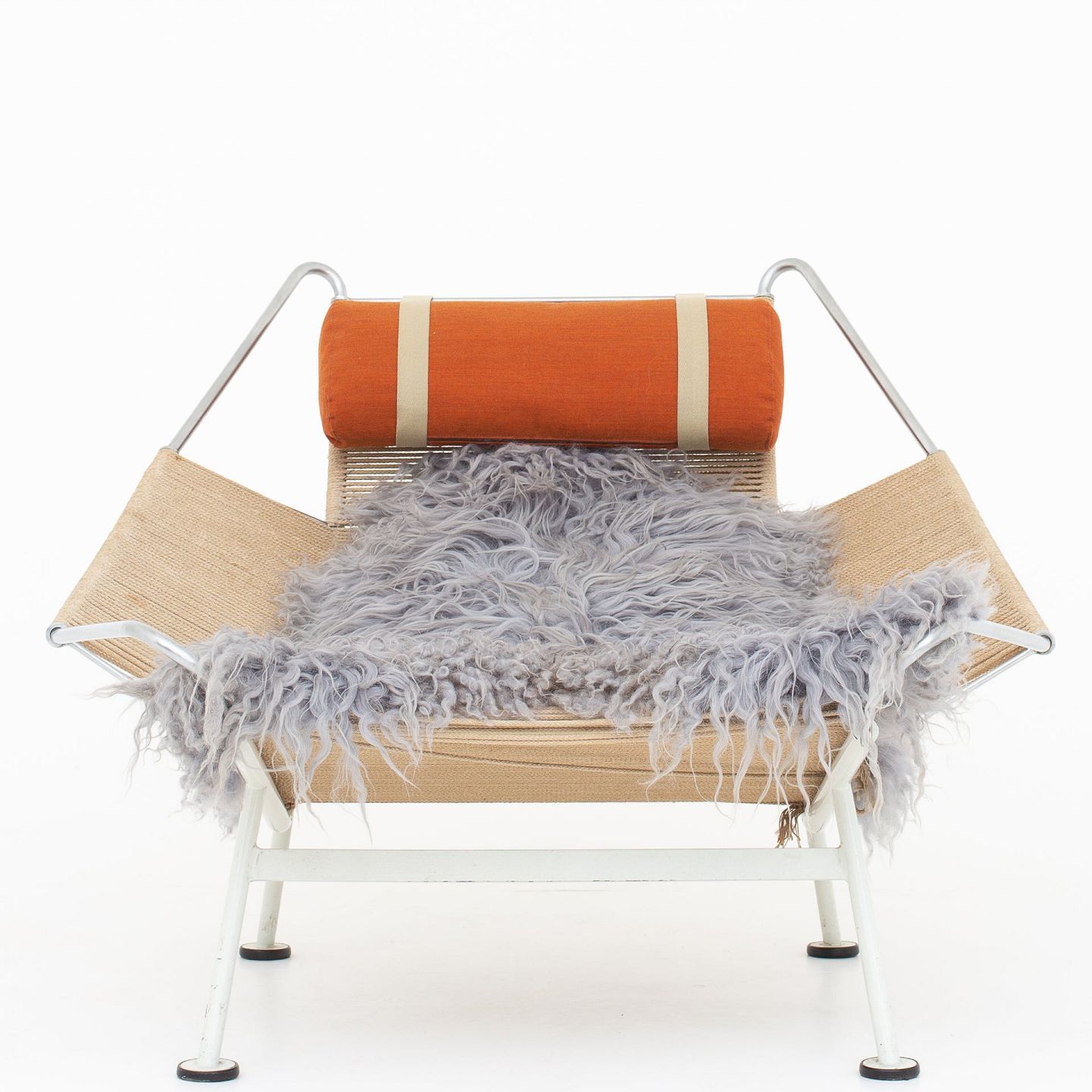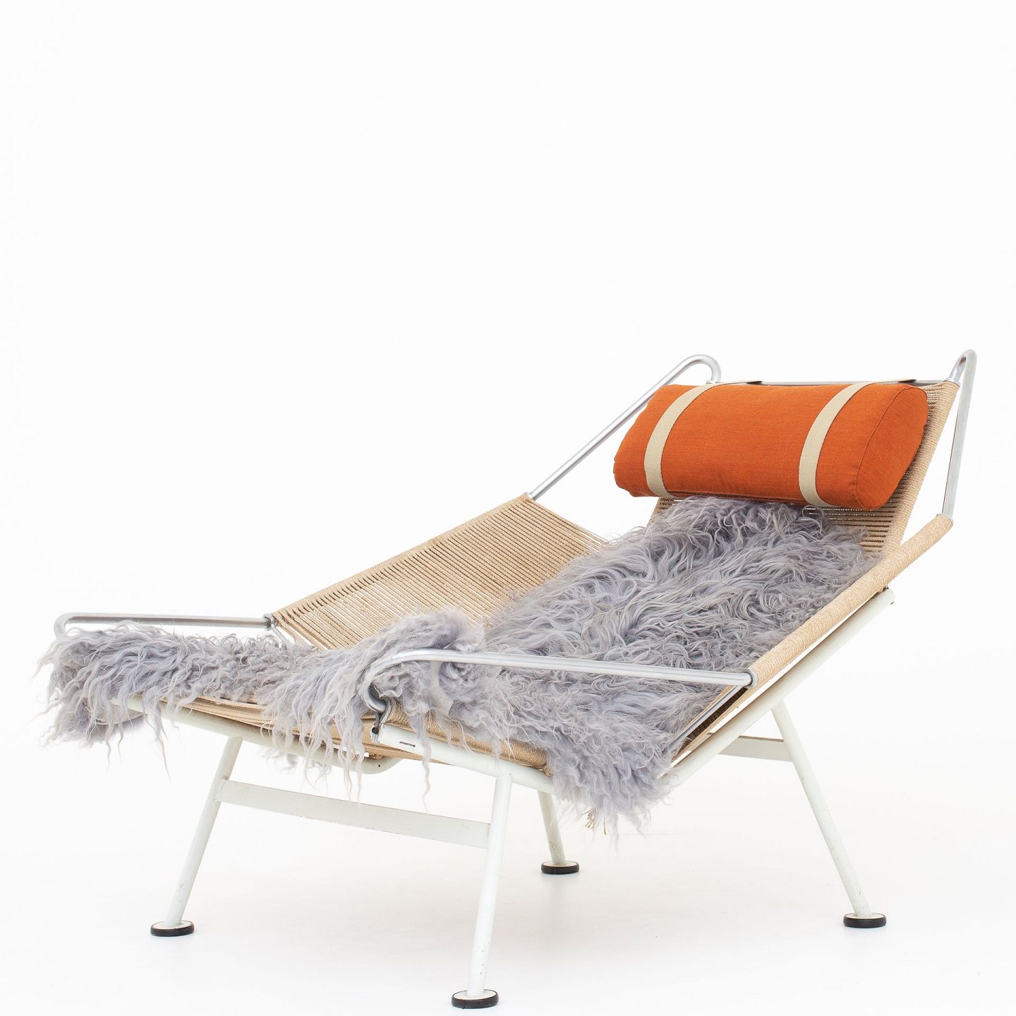 GE 225 - 'Flagline chair' with white base and original flagline and neck cushion. This is a model photo. The appearance of the cushion, lambskin and patina may vary. Please contact us for exact images of this product.