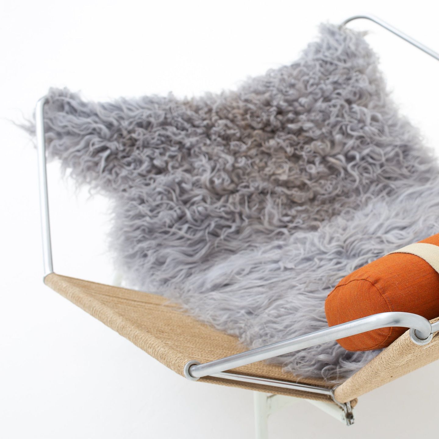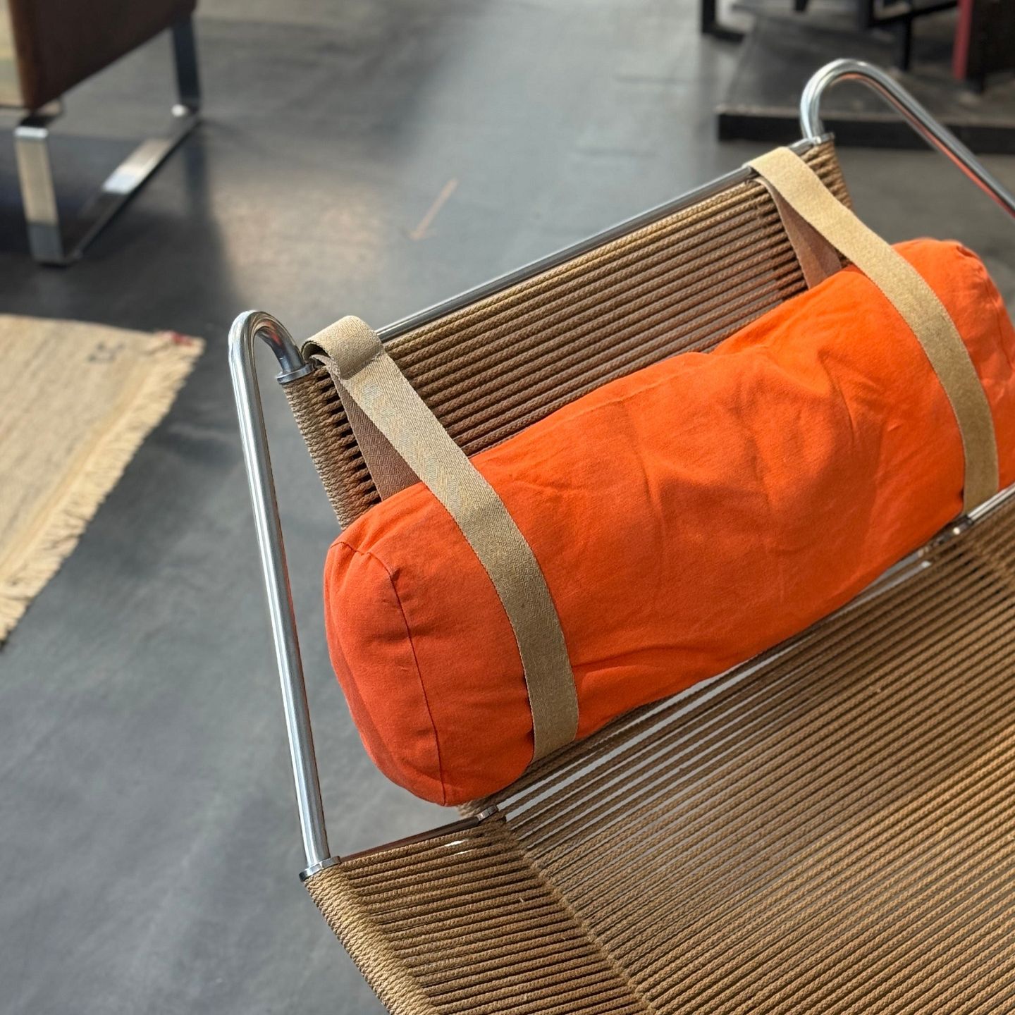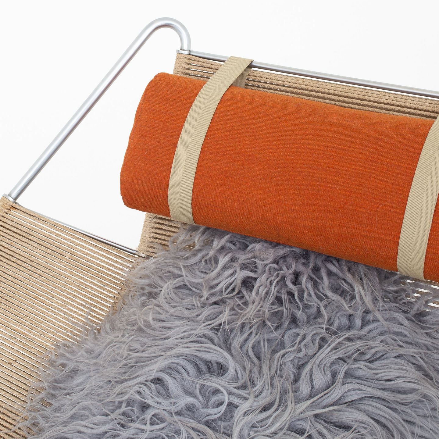 GE 225 - 'Flagline chair' with white base and original flagline and neck cushion. This is a model photo. The appearance of the cushion, lambskin and patina may vary. Please contact us for exact images of this product.