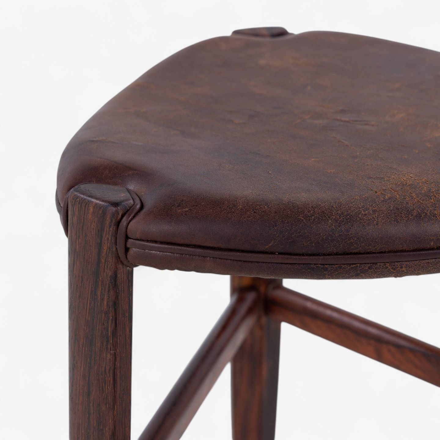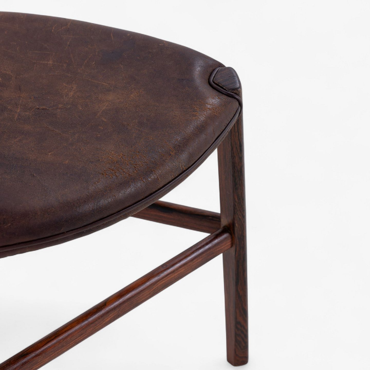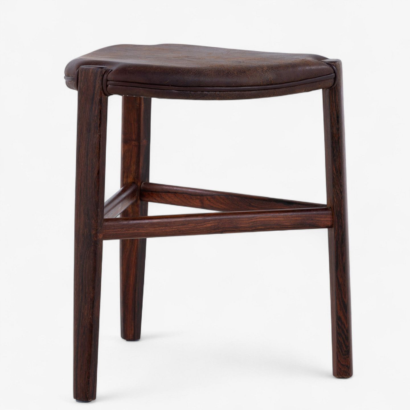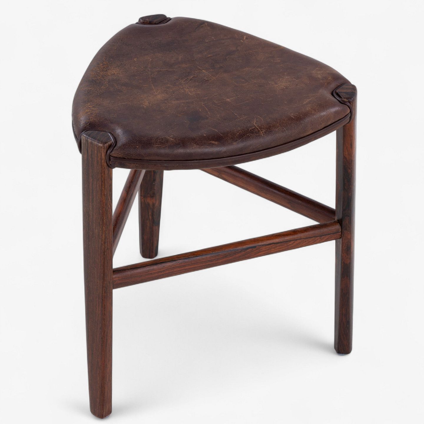 Taburet i Rio-palisander med tre ben og sæde i patineret læder.