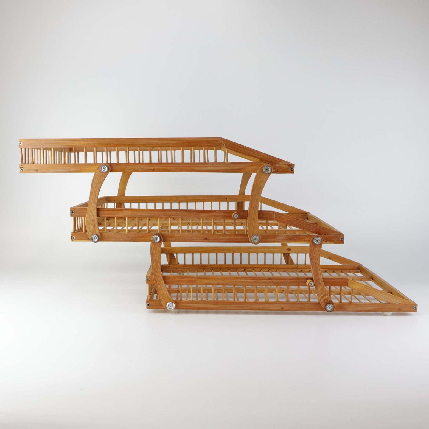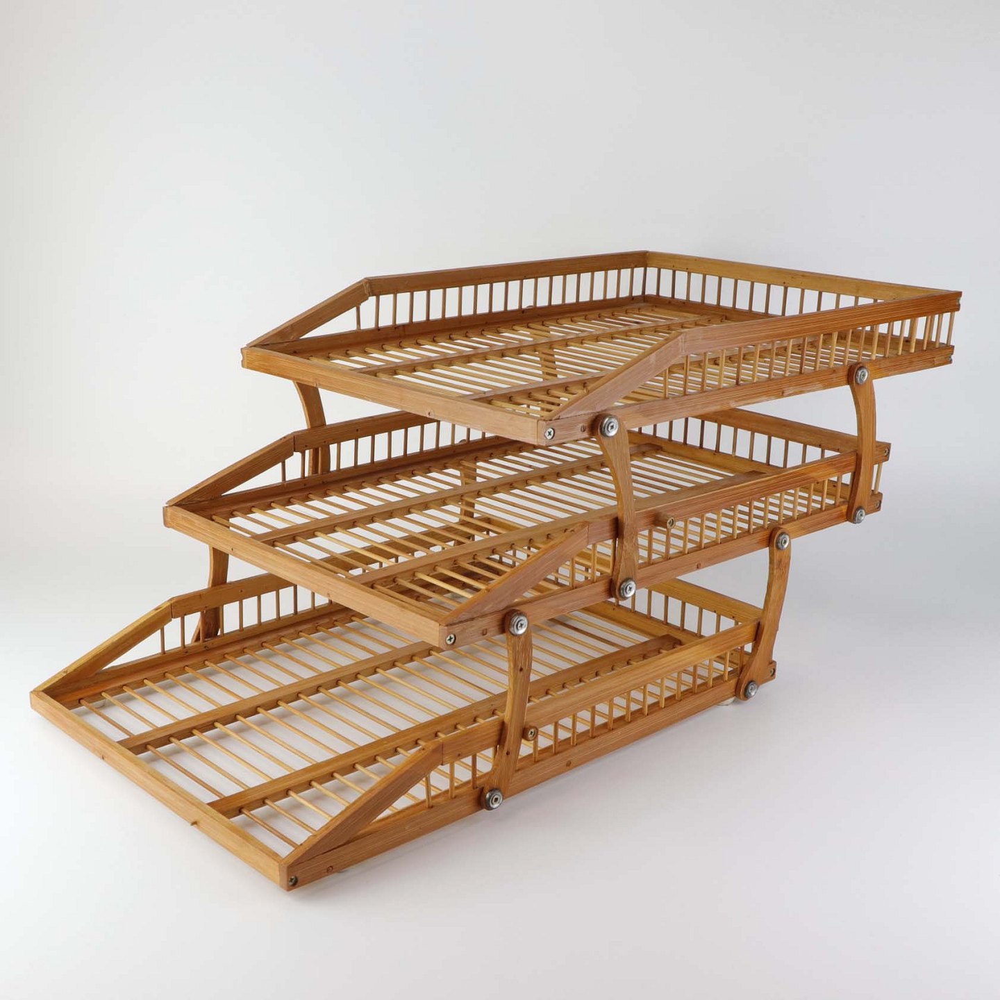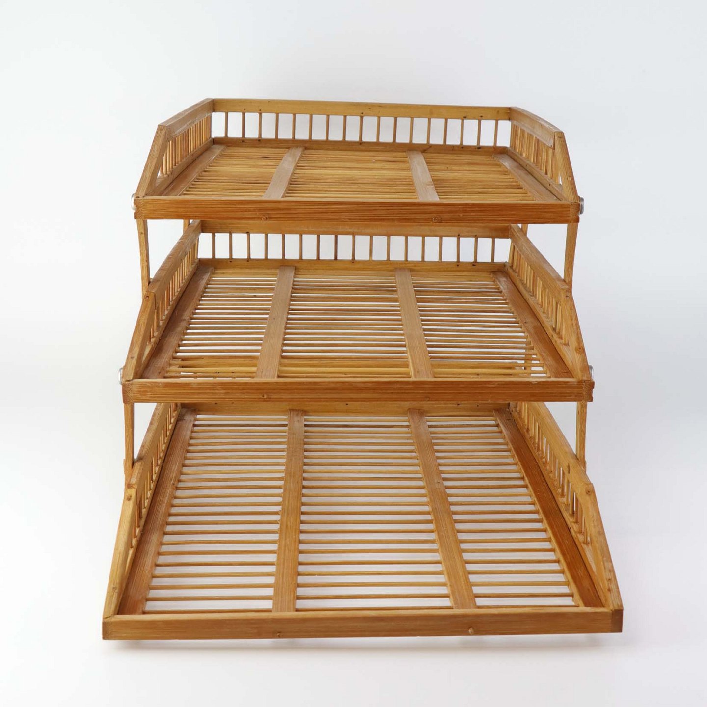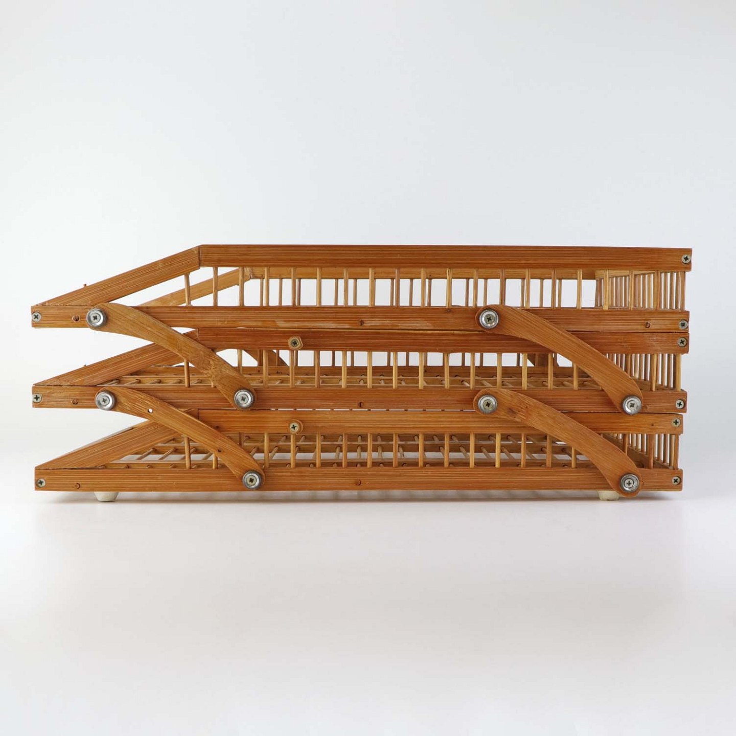 Papirbakke i bambus fremstillet i tremmeform. Brevbakken passer til A4 papir og består af tre sammensatte bakker og kan foldes ud efter behov.