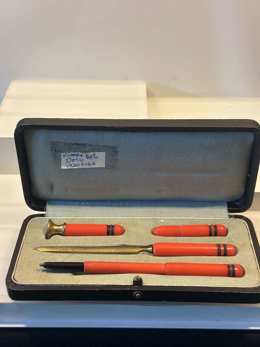 Art deco writing set, from the 1930s, set consists of a pen, a letter opener and an inkwell, all in red and brass elements