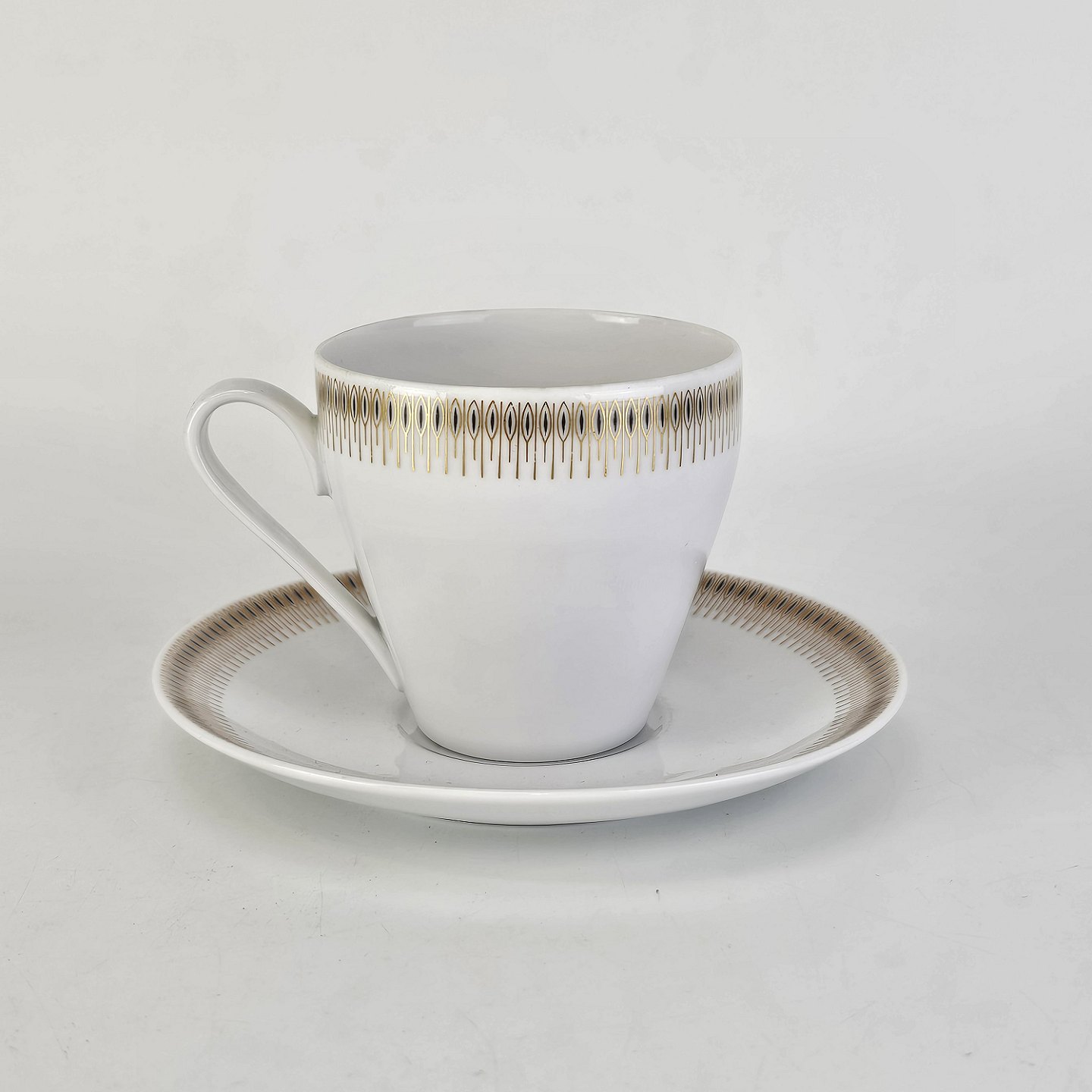 Kop med underkop i hvidt porcelæn med dekoration i guld fra stellet Trend 1220