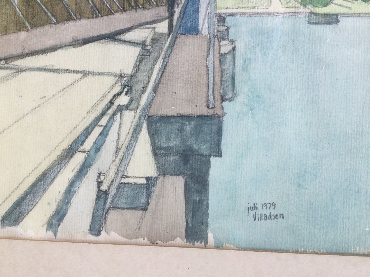 Akvarel signeret Villadsen 1979 - komposition med bro.