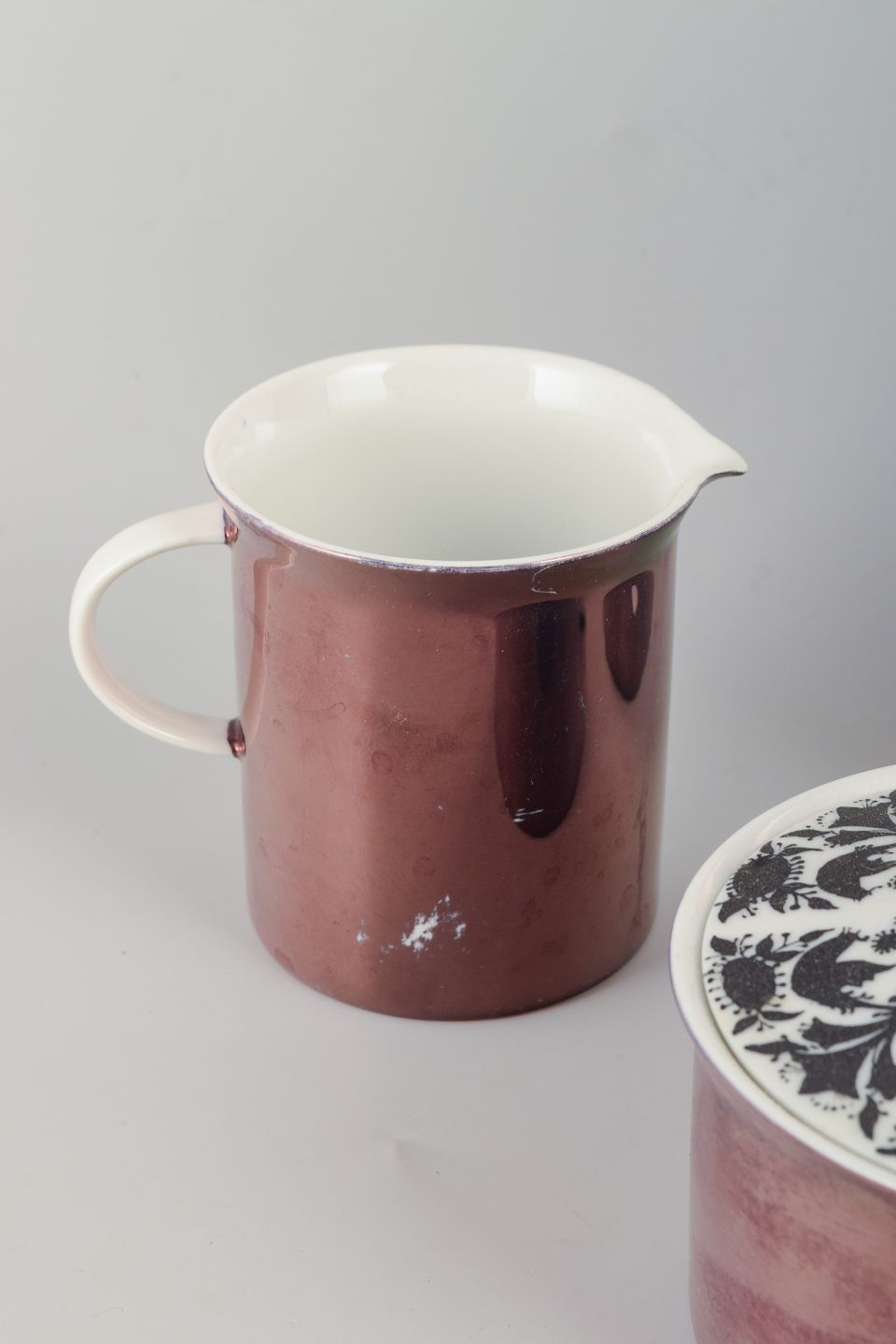 Rosenthal Studio-Line porcelænsstel bestående af kaffekande, flødekande og sukkerskål med låg. Kobberluster-dekoration på krop og låg, hvid glasur på inderside og hank/spids. Låg med sort knop og sort/hvidt grafisk mønster.