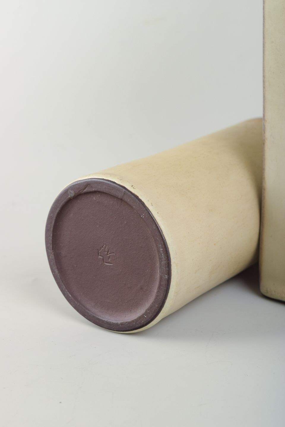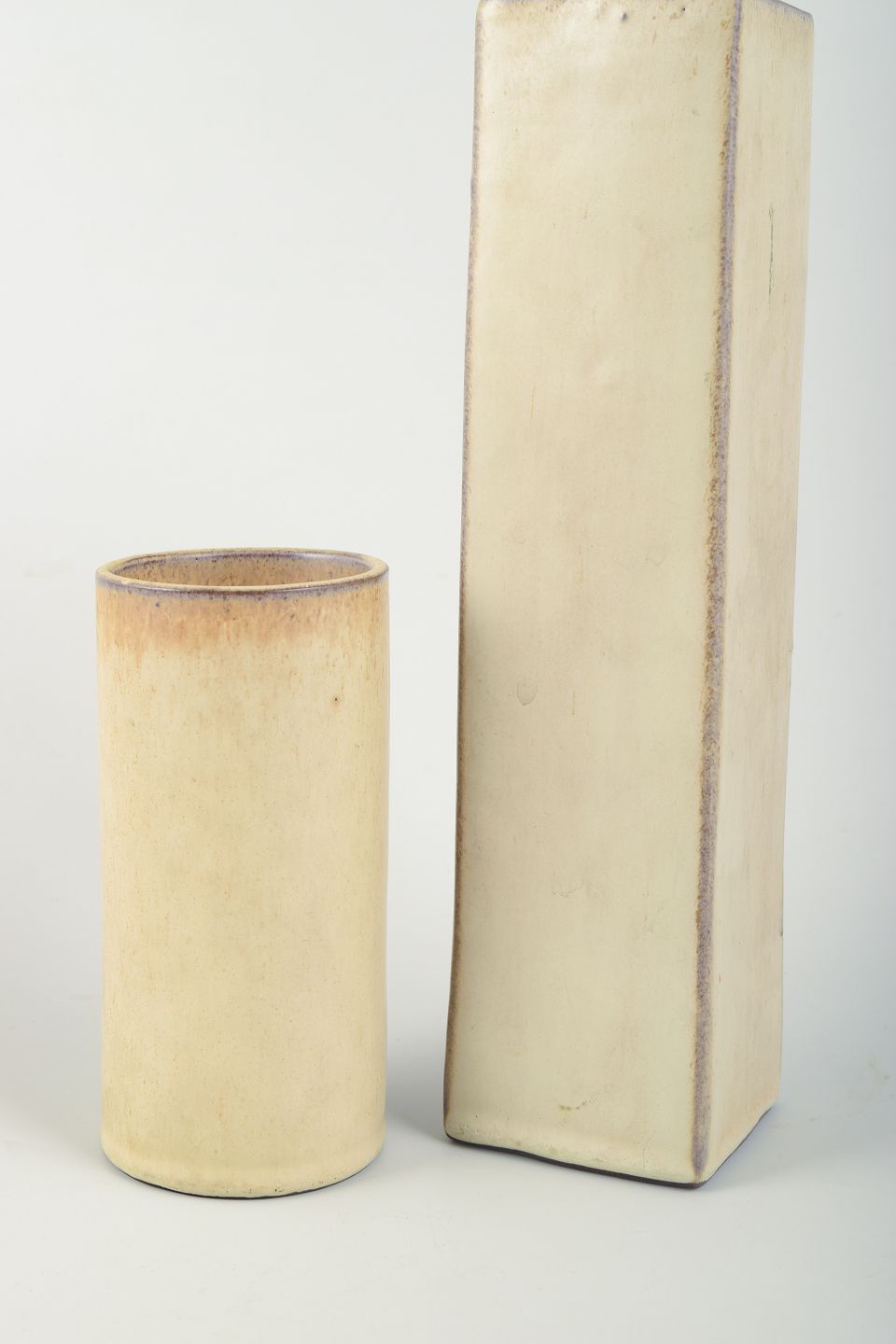 Elegant par af midtårhundrede studiekeramikvaser, sandsynligvis tyske, med rene, minimalistiske former. Sættet består af en høj, rektangulær vase og en cylindrisk vase.