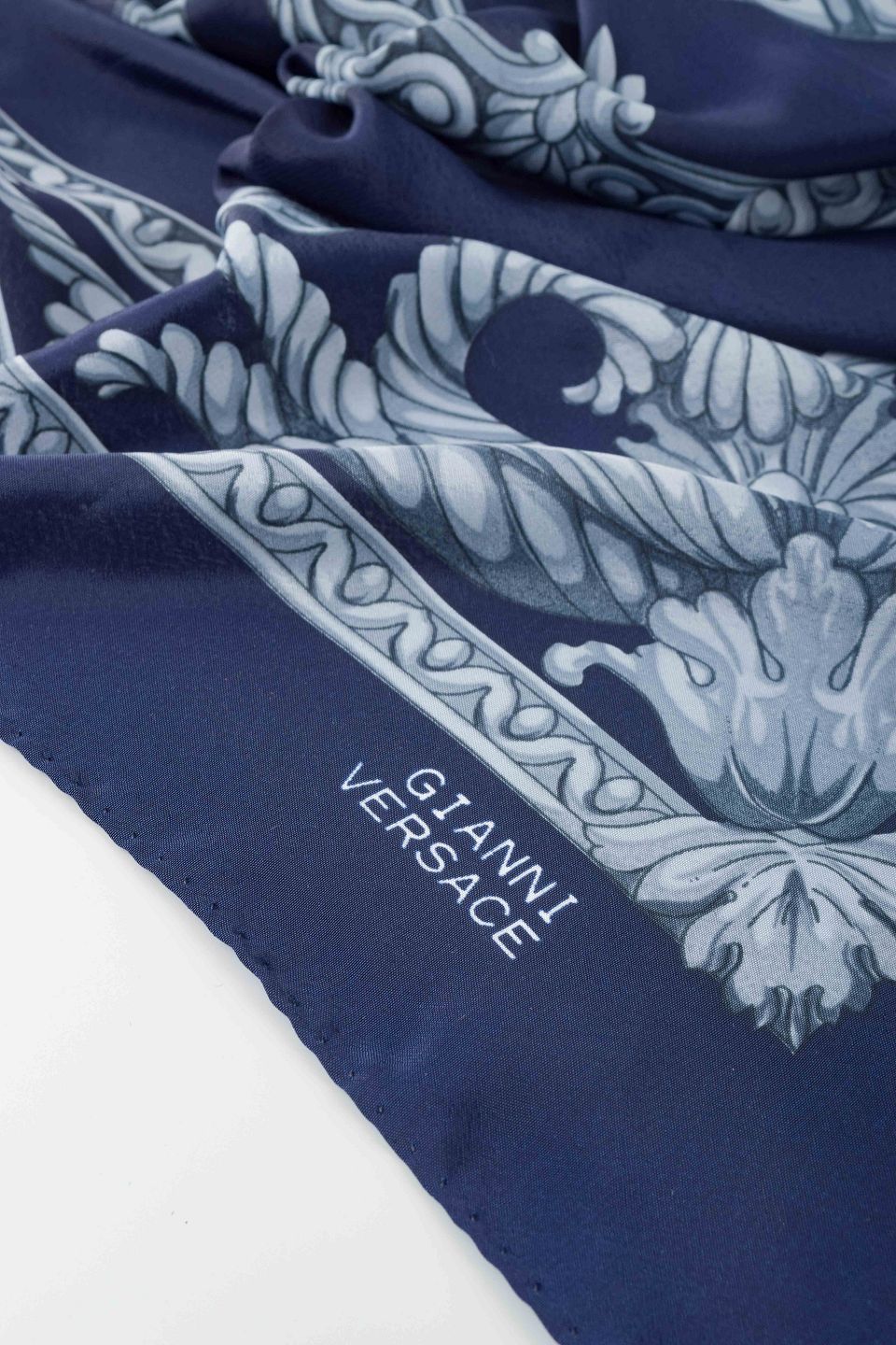 Exclusive pure silk scarf by Gianni Versace. Designed in deep blue with the iconic Medusa motif at the center, framed by ornamental borders and acanthus scrolls in shades of grey. A refined composition that unites the aesthetics of antiquity with Versace’s unmistakable language of luxury.