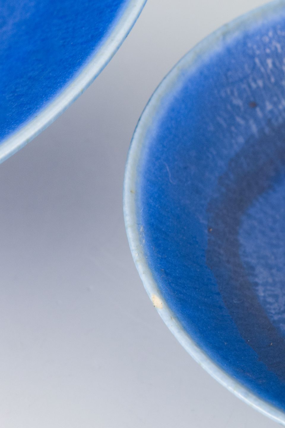 To stentøjsskåle i en smuk, intens blå glasur med levende overfladespil. Den enkle, raffinerede form giver plads til glasurens dybde, som varierer fra mat til blank i lysets brydning.