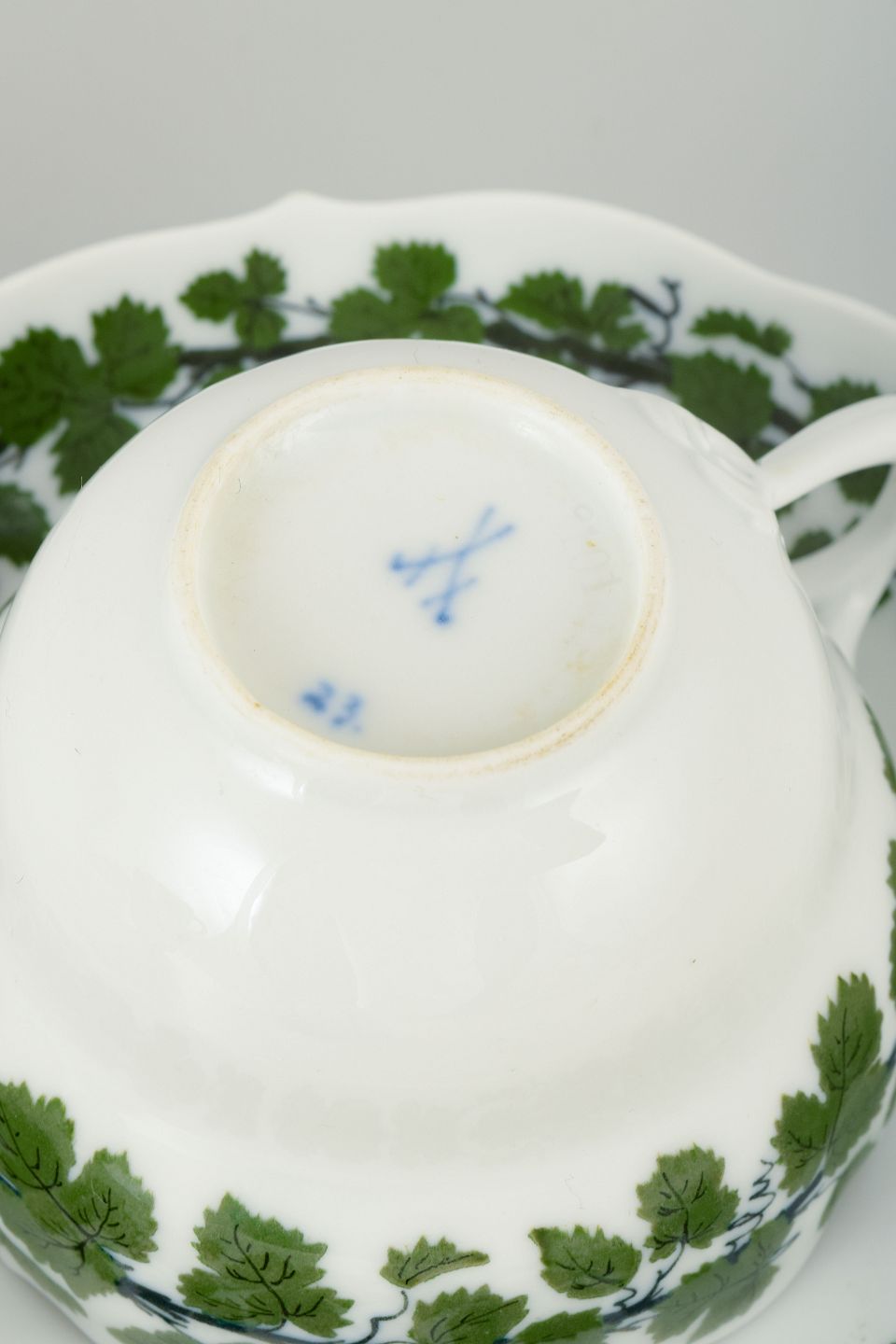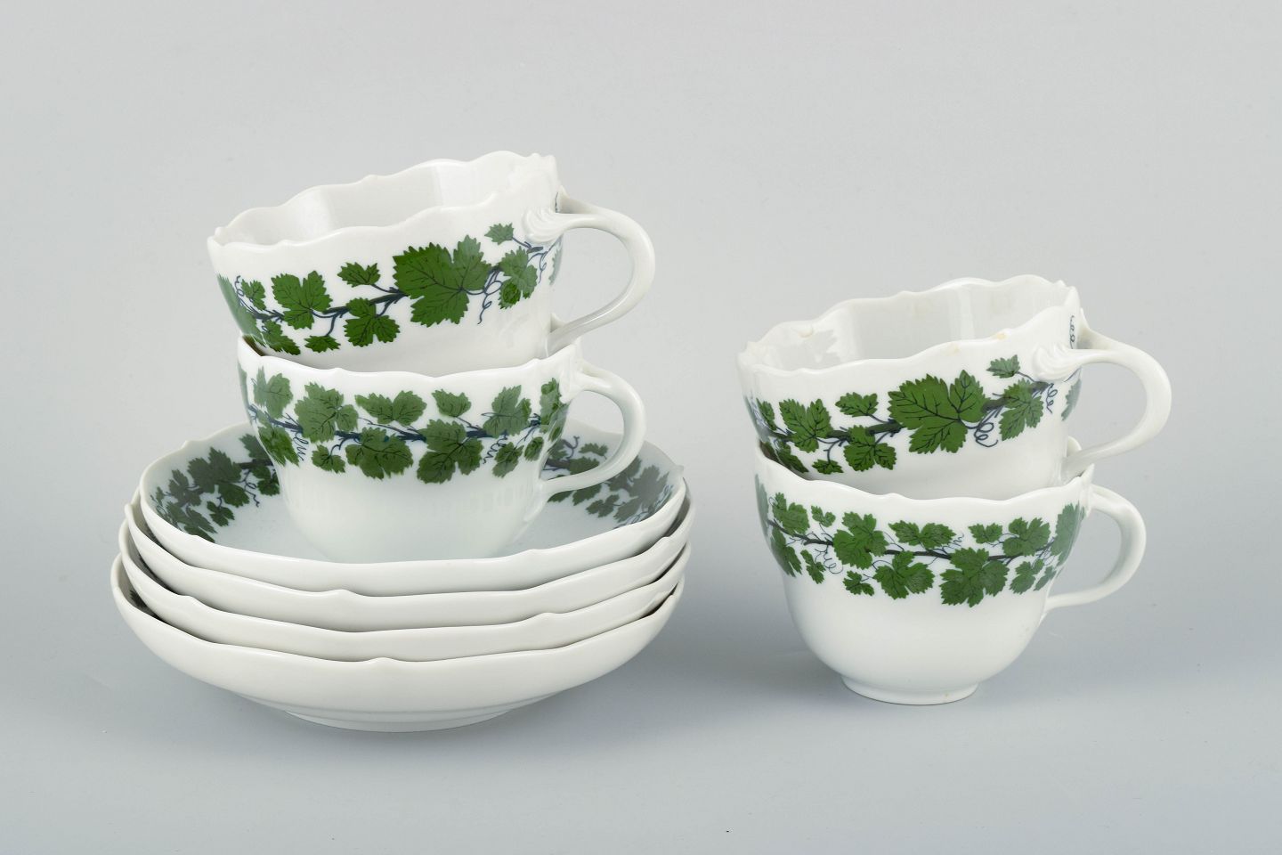 Meissen, 4 par kopper og underkopper, stel Vine-Leaf Pattern, “Voller grüner Weinkranz”.