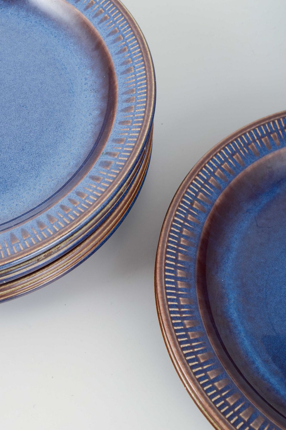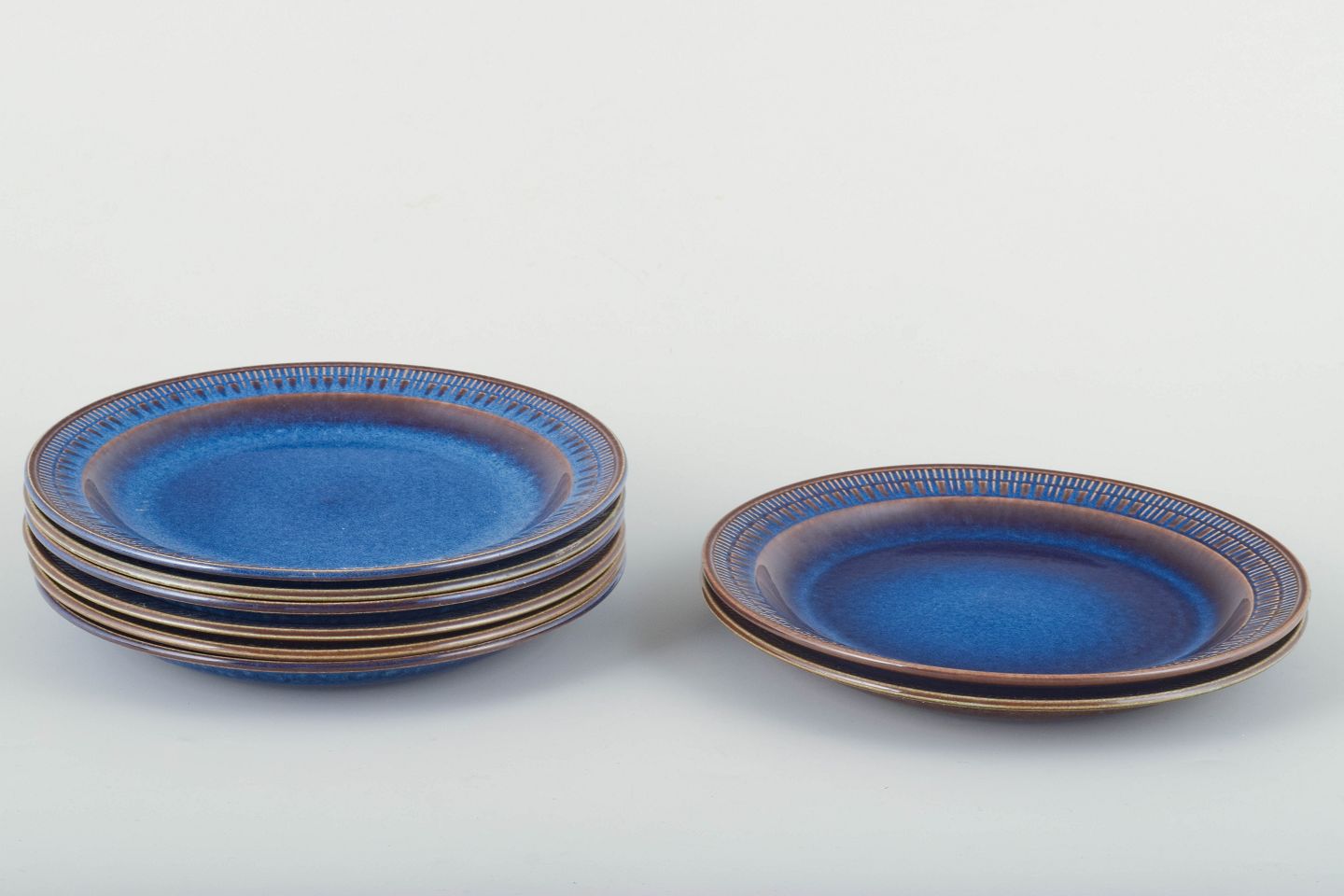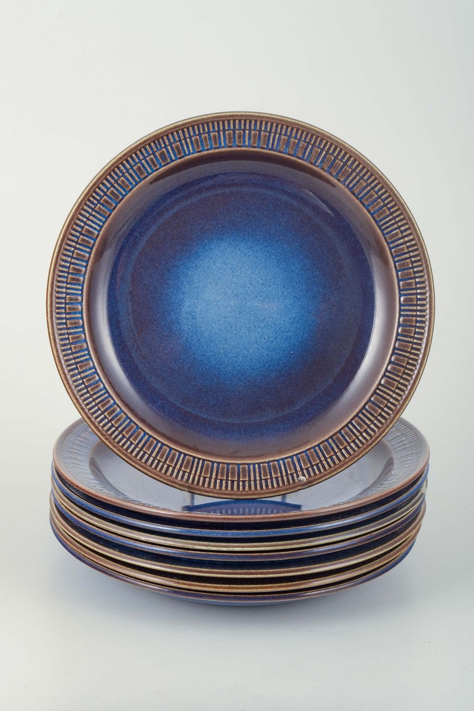 Set of 8 small luncheon plates from Gefle, Sweden, in the classic stoneware series Kosmos. The plates are decorated with a deep blue glaze with a brown rim and a characteristic relief pattern along the edge, giving the service its distinctive mid-century expression.
