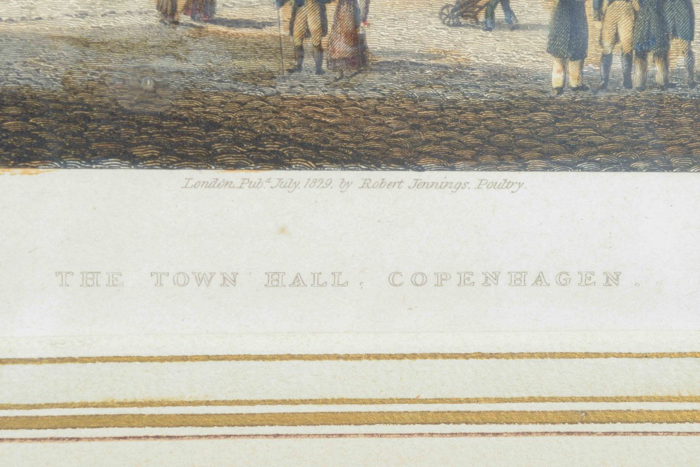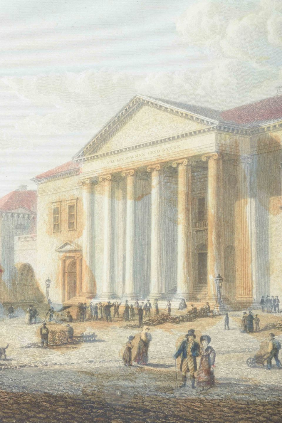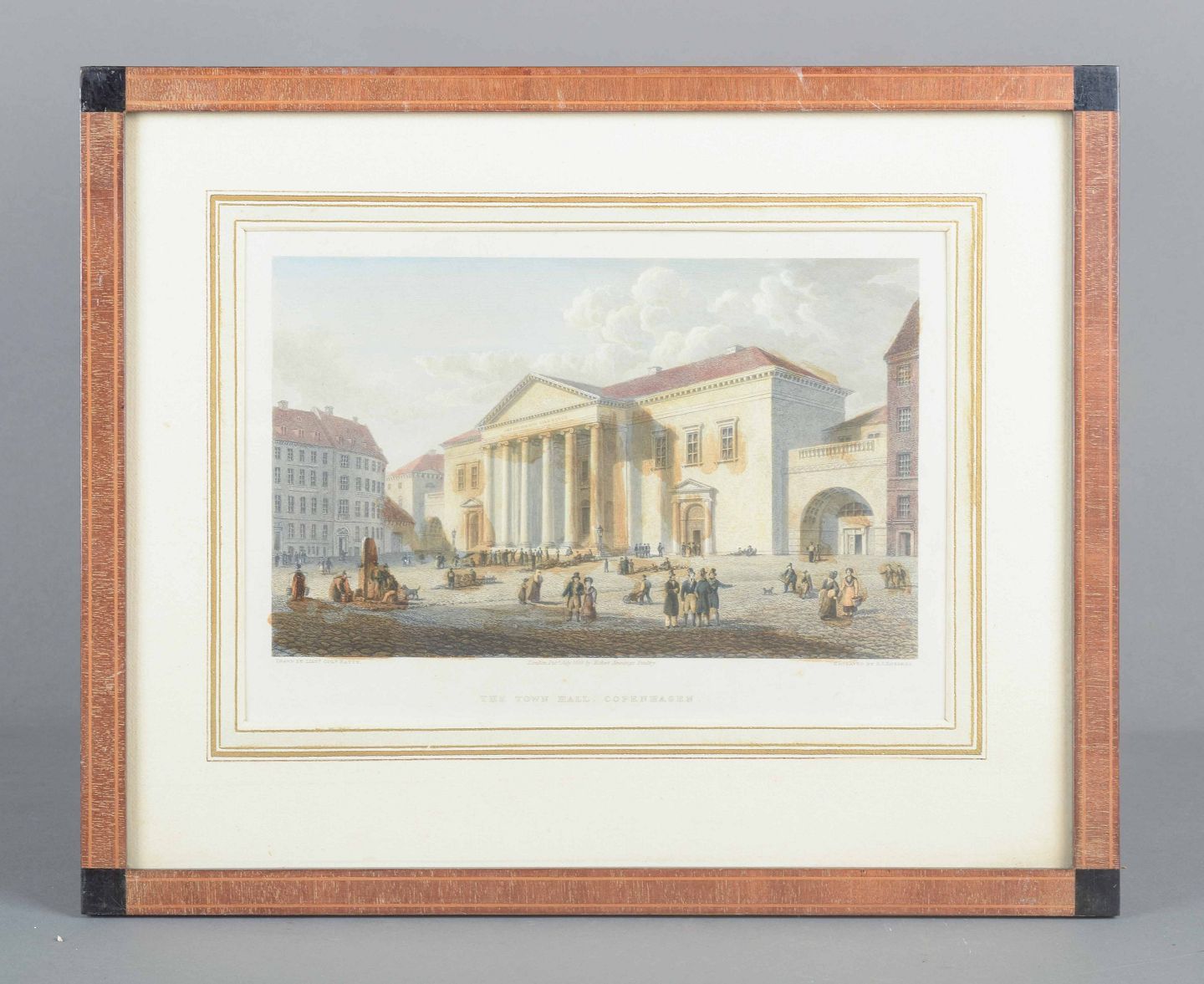 Et stemningsfuldt prospekt af Københavns rådhus (det tidligere klassicistiske rådhus, beliggende på Nytorv, opført 1803–1815 efter tegninger af arkitekt C. F. Hansen, nedrevet i 1890’erne). Motivet viser pladsen foran rådhuset med mennesker i tidens dragter, hestevogne og et levende bymiljø. Værket er tegnet af den engelske officer og rejsende Lieutenant Colonel Robert Batty (1789–1848), kendt for sine detaljerede prospekter fra europæiske byer, og graveret af E. L. Roberts.