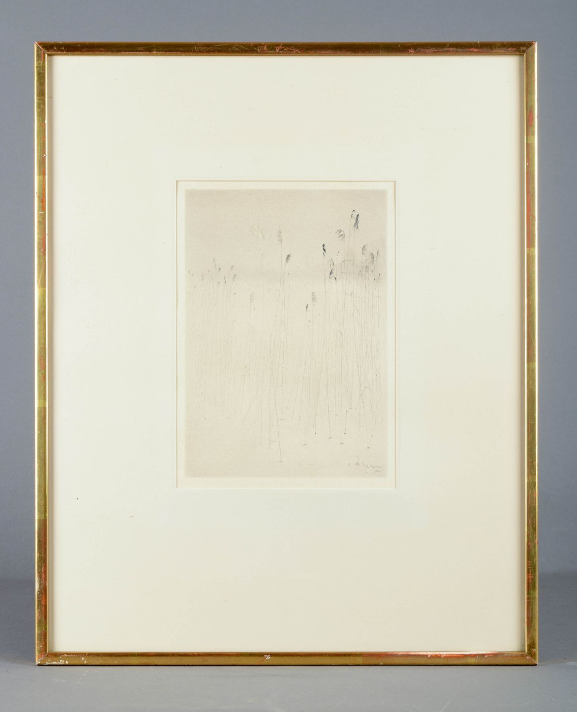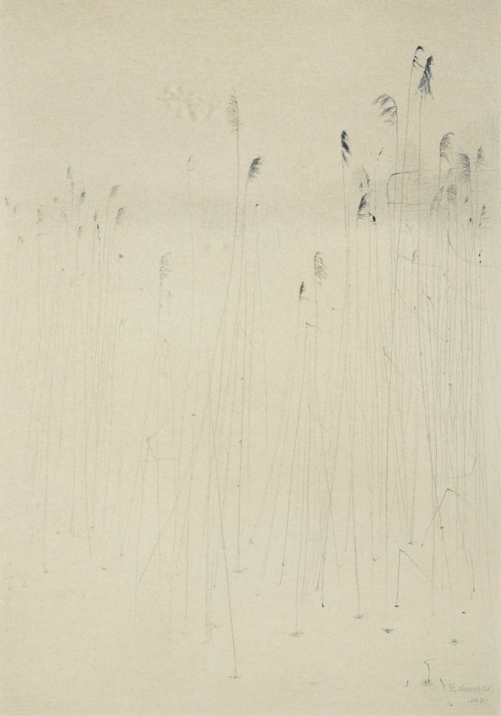 I dette sjældent subtile blad formår Gunnar Norrman at indfange naturens stilhed og vinterens askese gennem en næsten musikalsk gentagelse af de lodrette linjer, hvor sivets skrøbelige silhuetter svæver i et svagt diset lysrum. Den næsten asketiske enkelhed forædler motivet til en meditation over naturens rytme og forgængelighed. Her manifesteres Norrmans særegne sensibilitet, hvor den lavmælte gestus rummer både poesi og streng formbevidsthed.