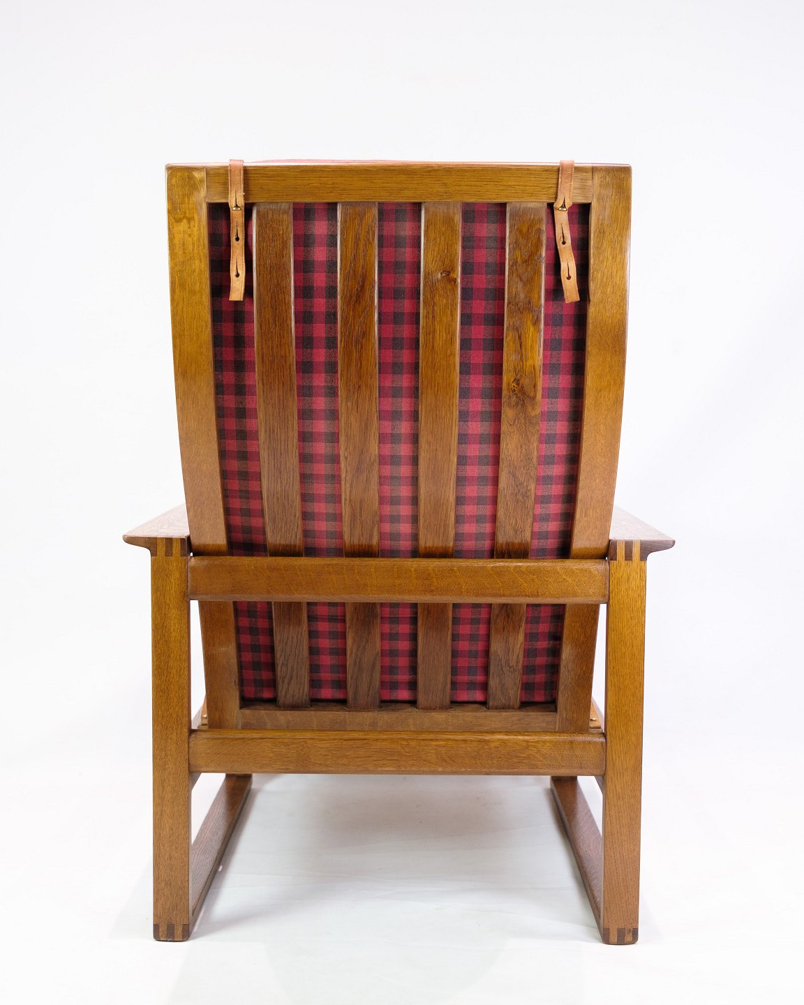 Original Slædestol, model BM2254, designet af Børge Mogensen i 1958 og udført af Fredericia Stolefabrik. Stolen er lavet i olieret egetræ med tappede samlinger og løse hynder i rødt/ternet stof samt nakkepude.
