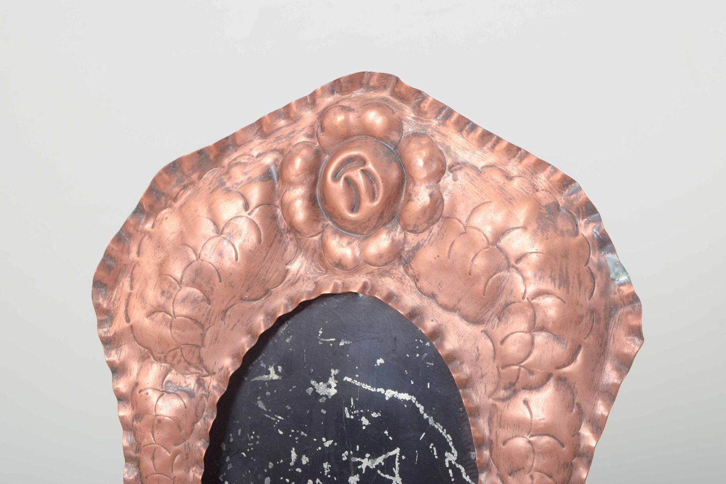 To dekorative billedrammer i præget kobber med blomstermotiver og oval åbning. Begge rammer er forsynet med indskriften “Udstillingens Hæderspris 1933”, hvilket vidner om deres oprindelse som præmier ved en udstilling. Bagsiden med støttefod til placering på bord.