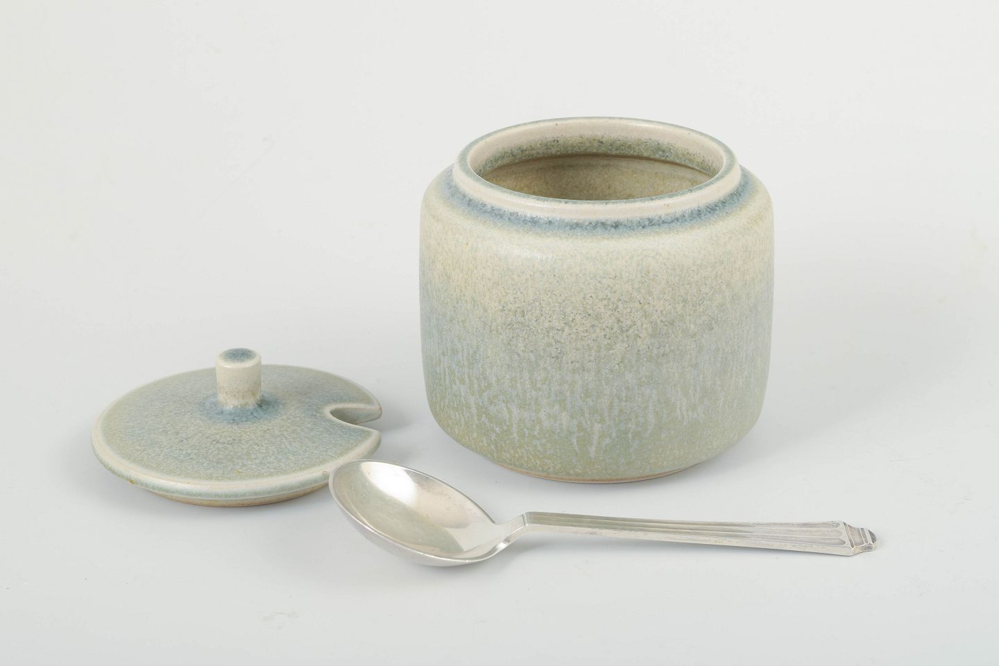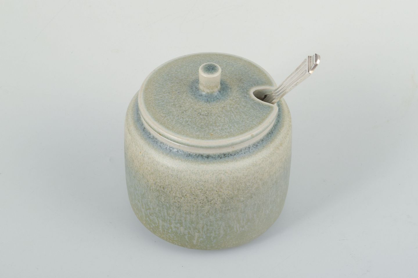 Cylindrisk marmeladekrukke i stentøj med låg. Glasur i afdæmpede grøn-blå nuancer med diskret løbende effekt. Medfølgende ske i sterling sølv, stemplet Hans Hansen. Bunden med indridset mærke “Palshus Denmark” samt modelangivelse.