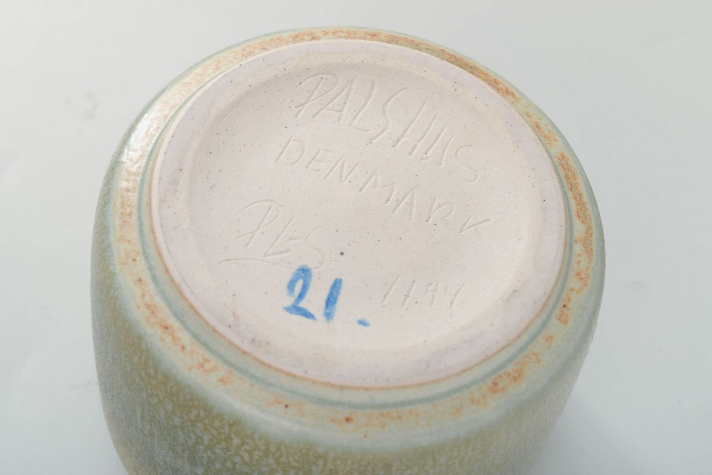 Bio: Palshus Keramik blev grundlagt i 1948 af Annelise og Per Linnemann-Schmidt i Saxkøbing. Værkstedet er især kendt for sine raffinerede stentøjsglasurer i grønne og blå nuancer. Hans Hansen (1884–1940) og hans efterfølgere står som nogle af Danmarks mest anerkendte sølvsmede, kendt for skandinavisk modernisme i sølv.