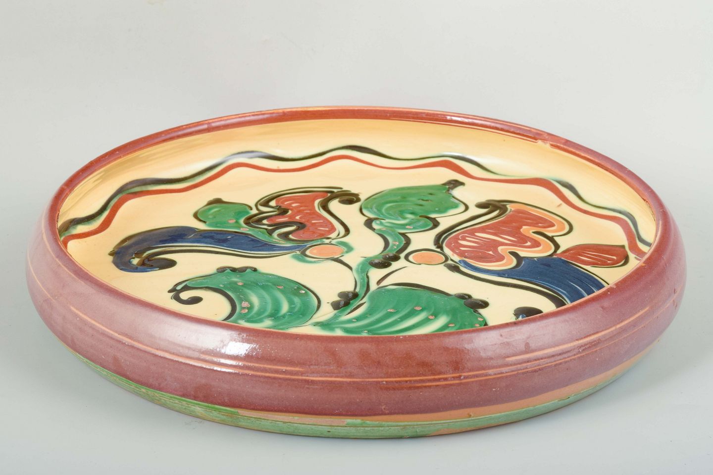 Dekorativt væg- eller serveringsfad i glaseret keramik med polykromt blomstermotiv i stærke farver på lys bund. Profilkant i rød glasur.