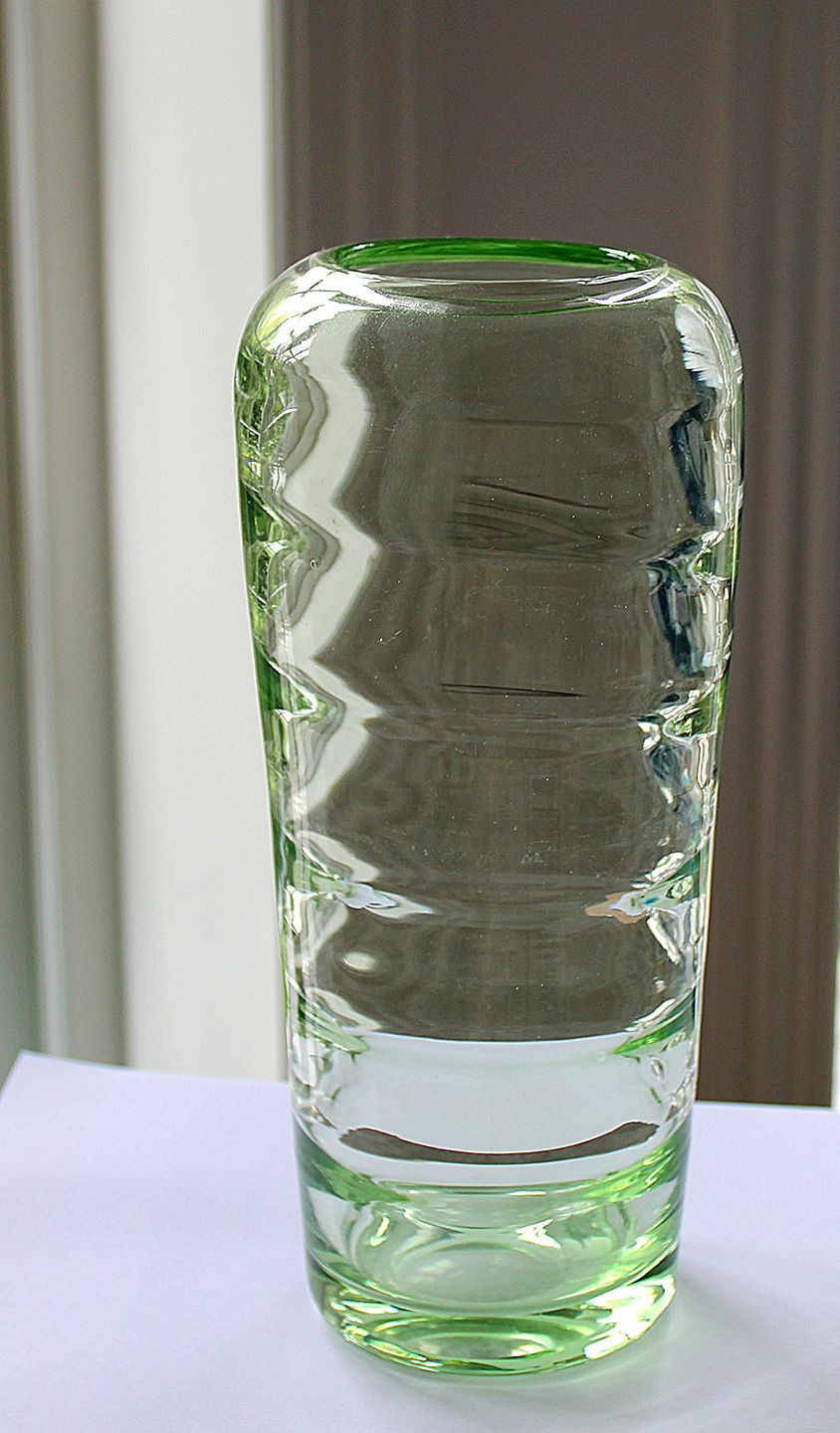Antagelig Holmegaard, Neongrøn transparent vase med riller. Højde 25 cm. Diameter 11,5 cm. Rundslebet i bund. Flot stand med enkelte luftbobler og få brugsspor. Pris: 475 kr.