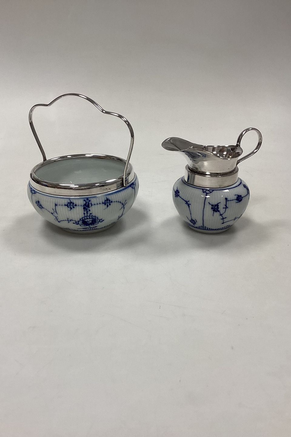 Tysk musselmalet Sukker og Fløde sæt, med metal montering, muligvis nikkel.