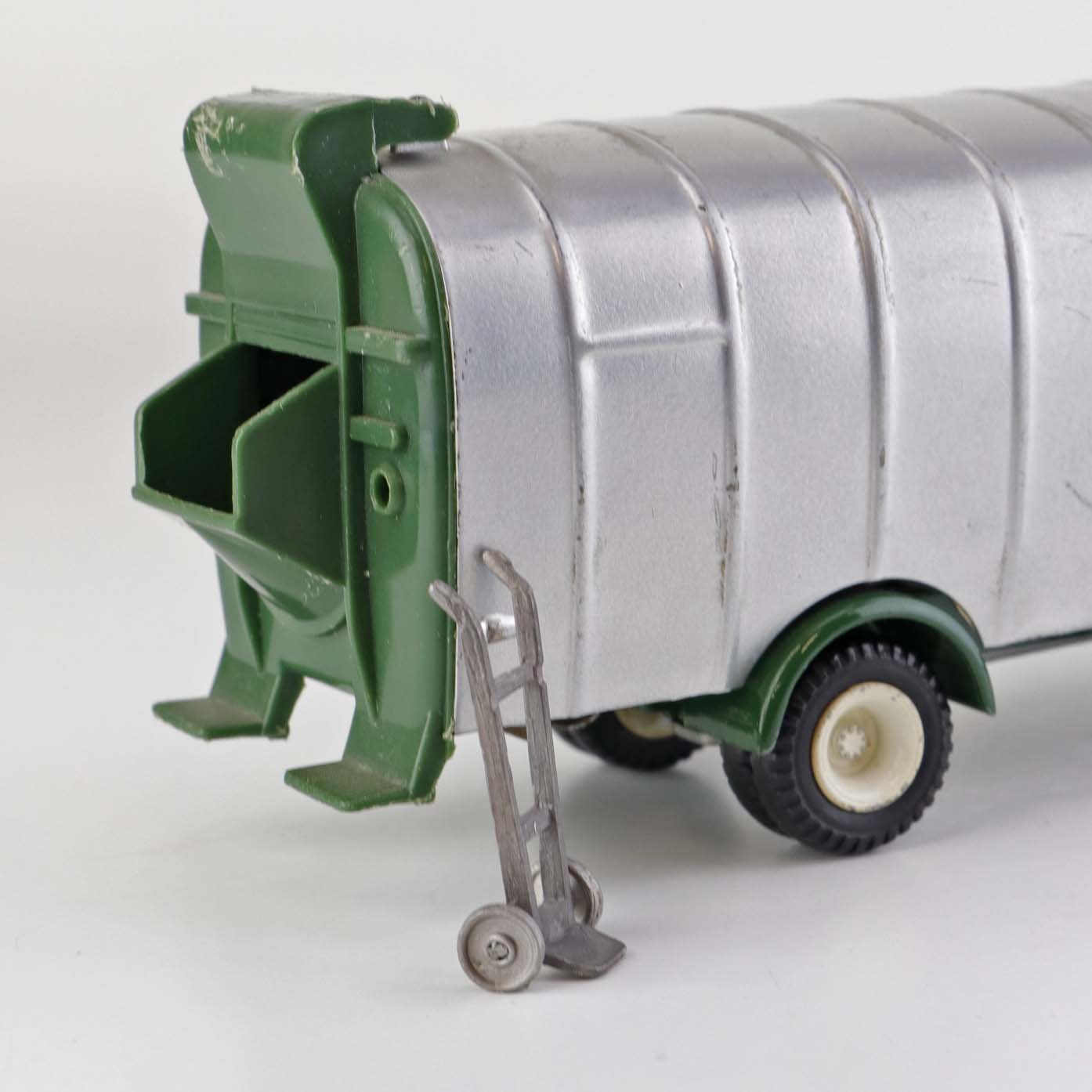 Legetøjsbil. Affaldsbil med sækkevogn i lakeret metal med gummi hjul.