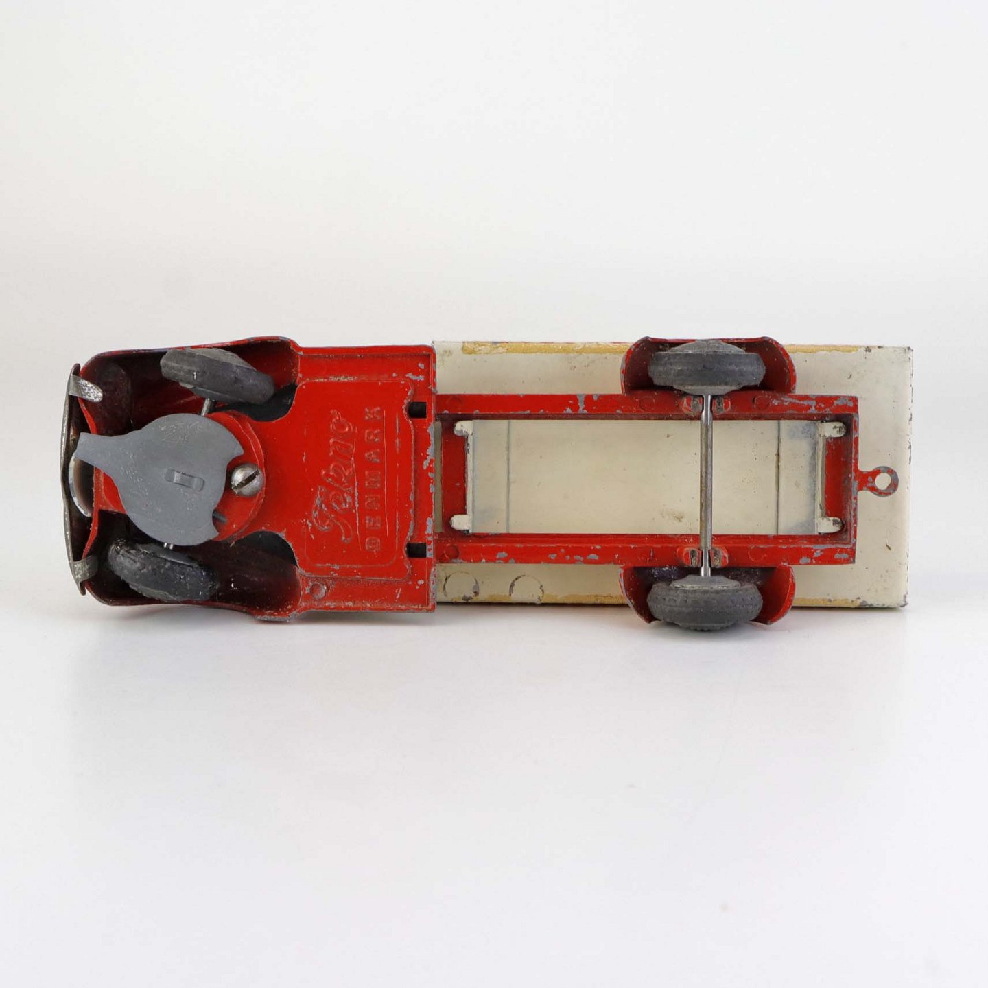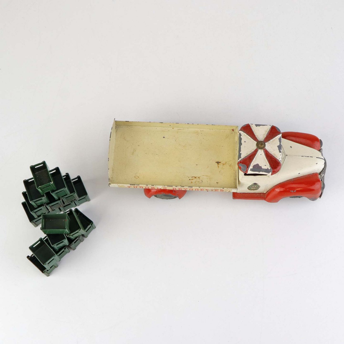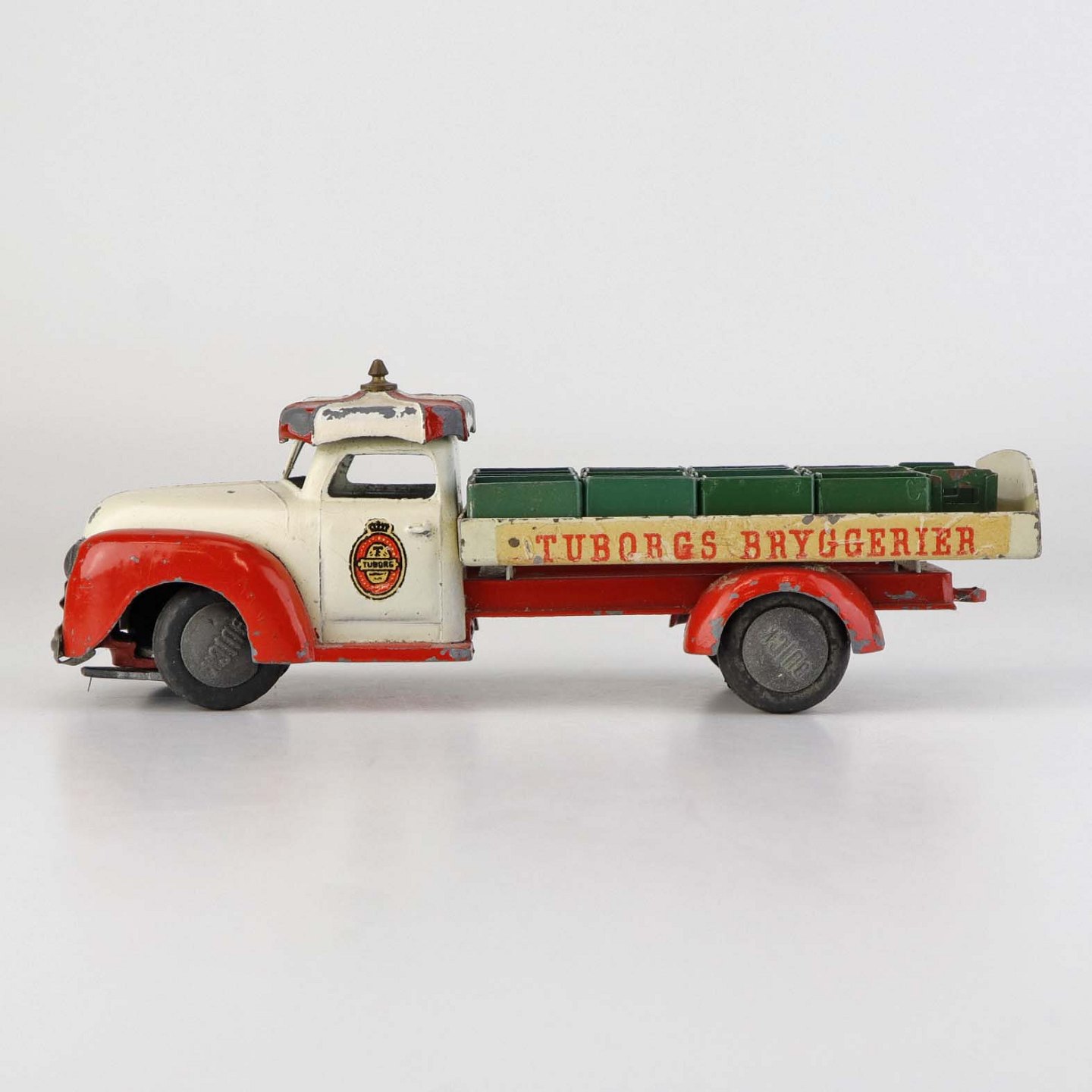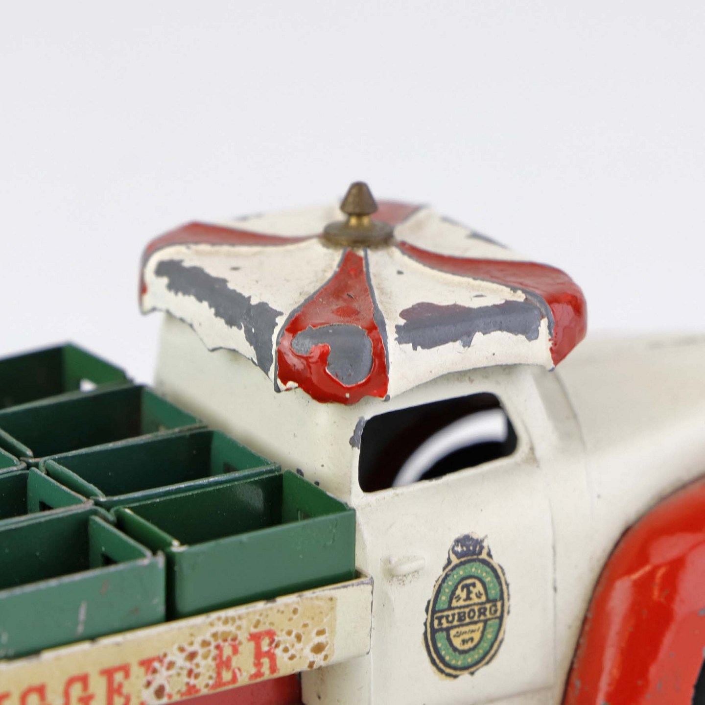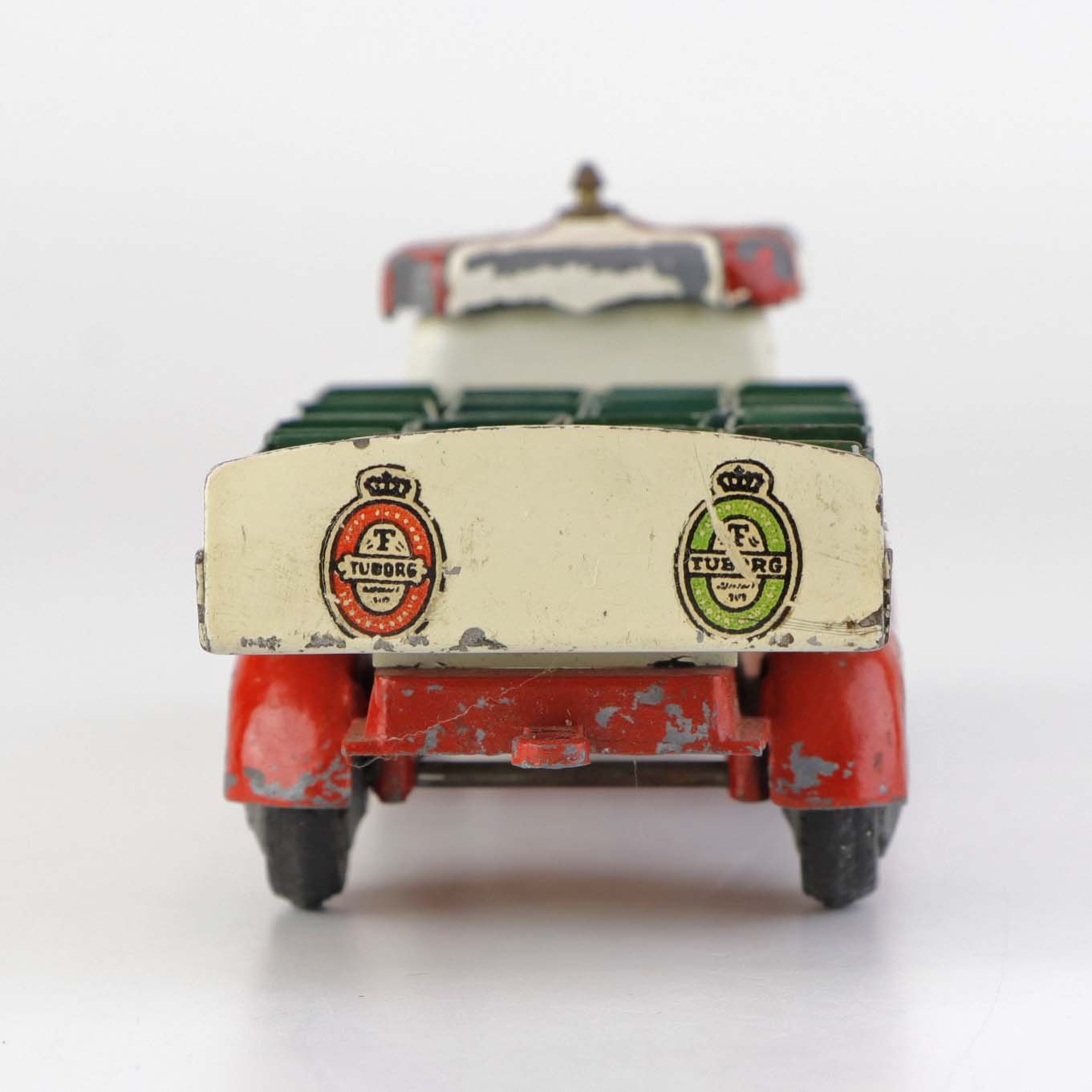 Legetøjsbil Tuborg ølbil med teksten Tuborg bryggerier samt 18 løse ølkasser i grøn metal. Bilen er i hvidlakeret metal med gummi hjul.