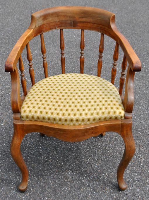 Dansk armstol i bøgetræ, 19. årh. Med capriole ben og sprosser. Gult stof. H.: 76 cm. B.: 56 cm. D.: 51 cm.