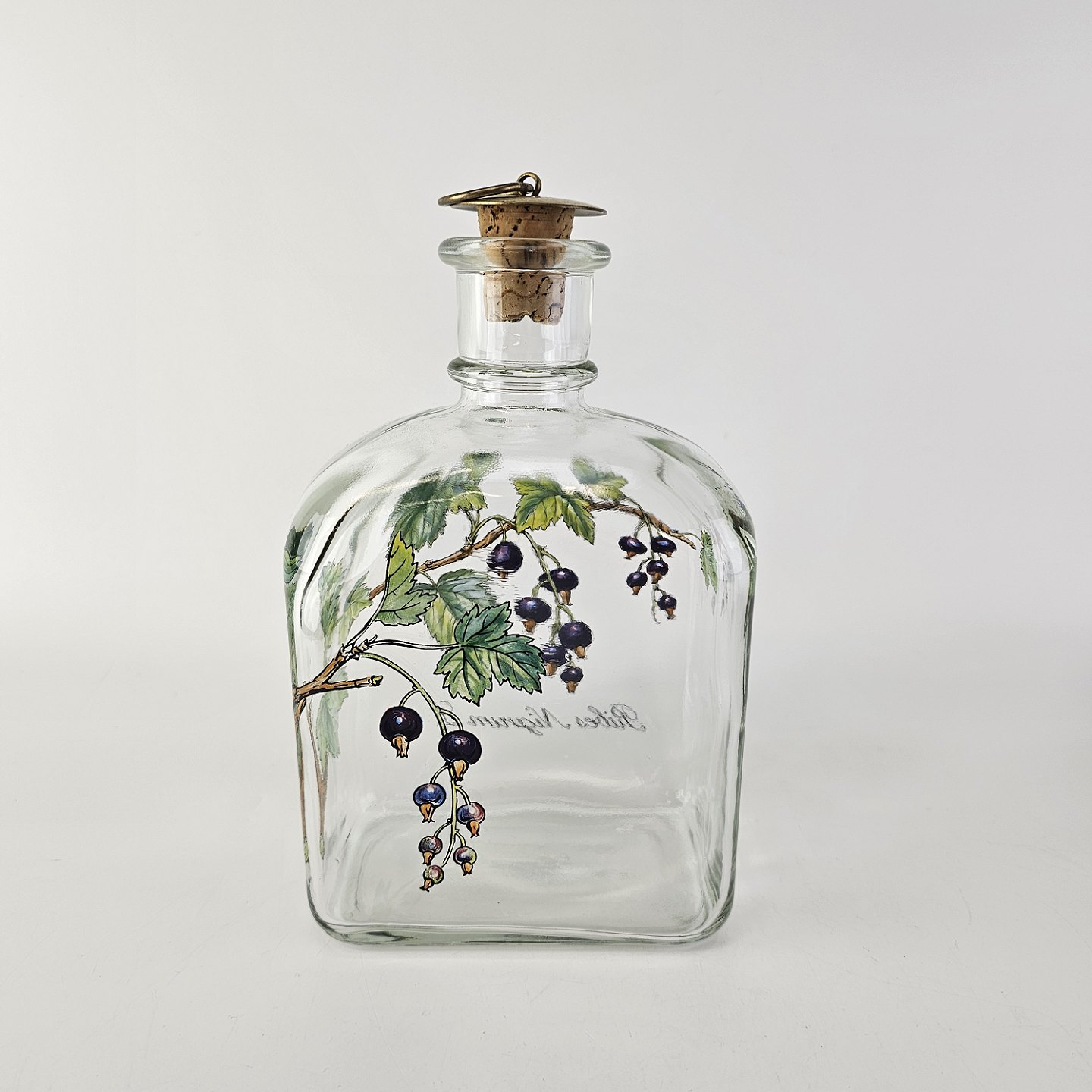 Karaffel i klart glas med korkprop fra serien Brændevins Amatøren, dekoreret med en gren af solbær og teksten Ribes Nigrum L.