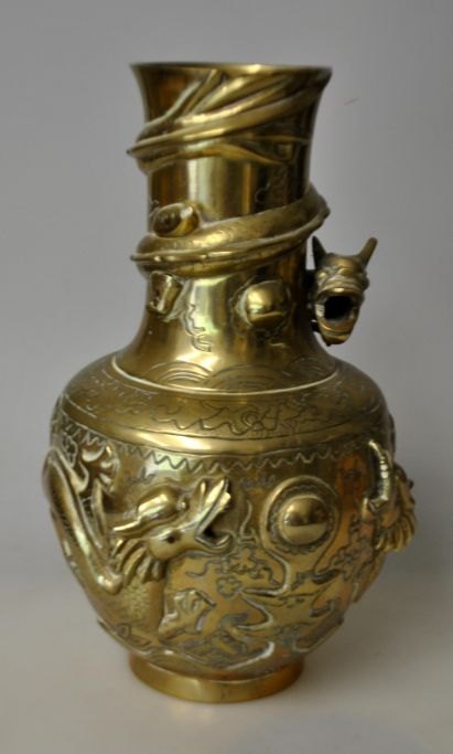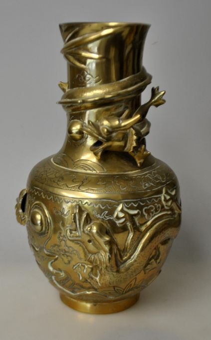 Chinesische Bronzevase, 20. Jahrhundert. Verziert mit gleitenden Drachen. Der Korpus ist reich mit Pflanzen im Relief verziert. Gestempelt. Höhe: 24 cm.