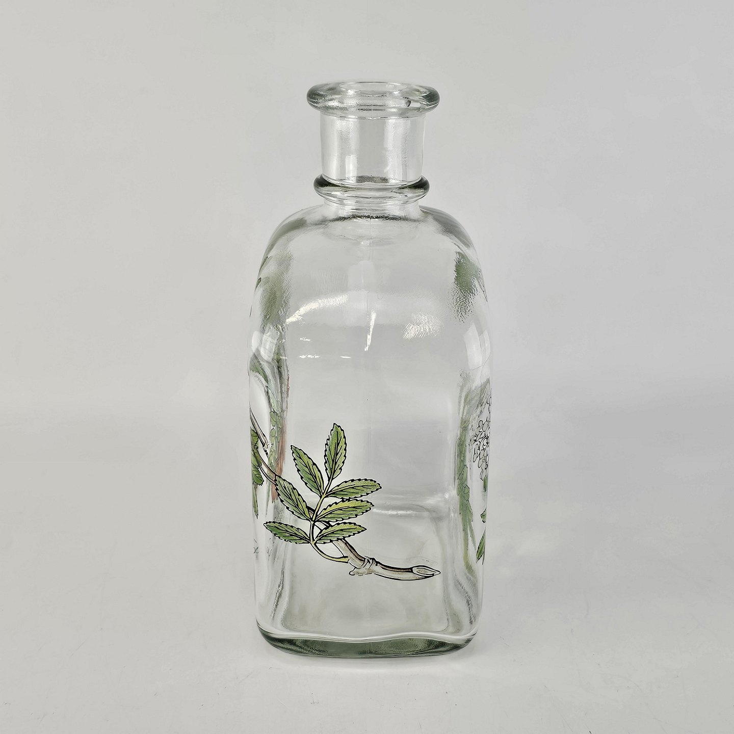 Karaffel i klart glas med korkprop fra serien Brændevins Amatøren, dekoreret med en gren af rønnebær og teksten Sorbus Aucuparia L.