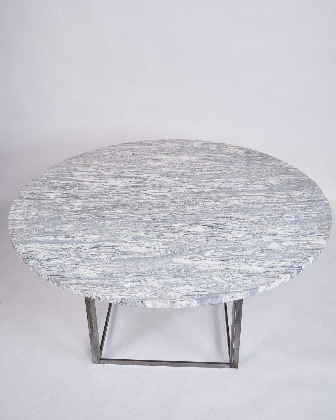 Rare dining table, model PK54, designed by Poul Kjærholm and produced by E. Kold Christensen in the 1960s. The table is made with a solid round cipollini marble top, supported by a steel frame, characteristic of Kjærholm's minimalist design.