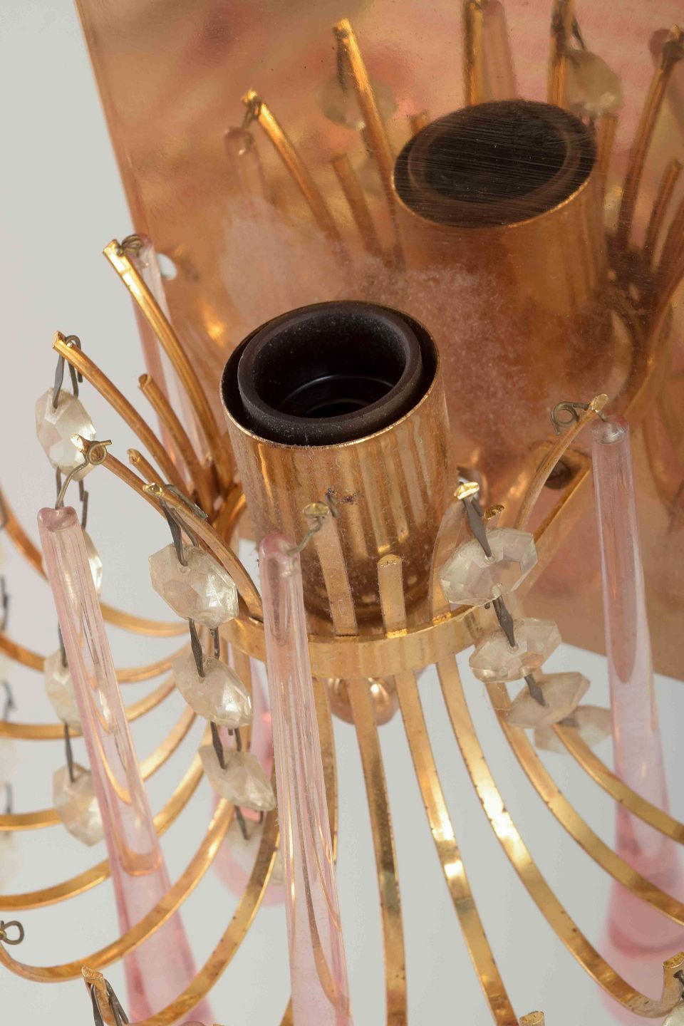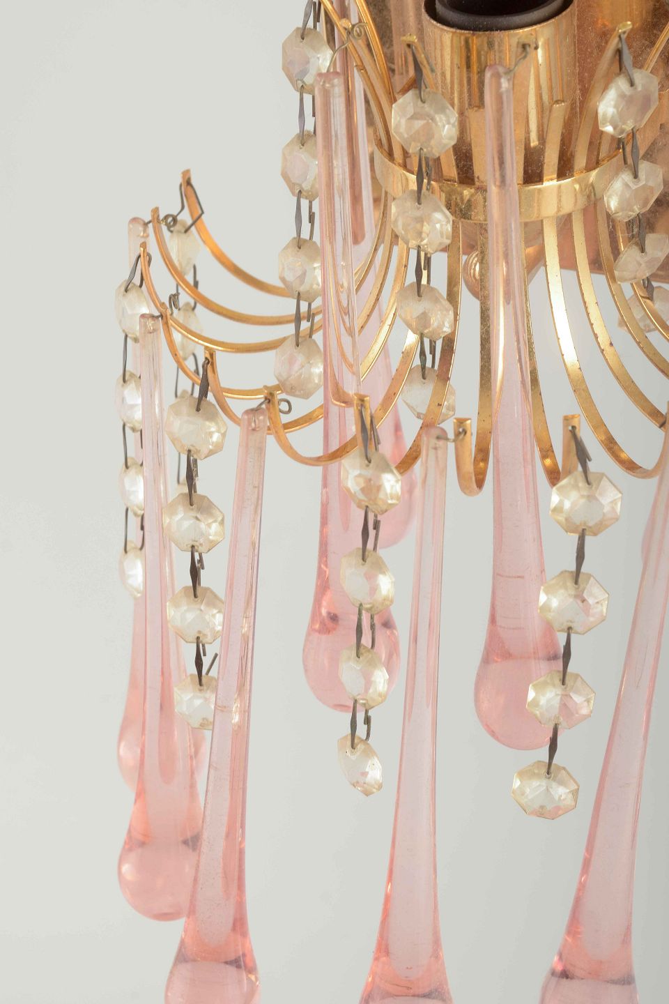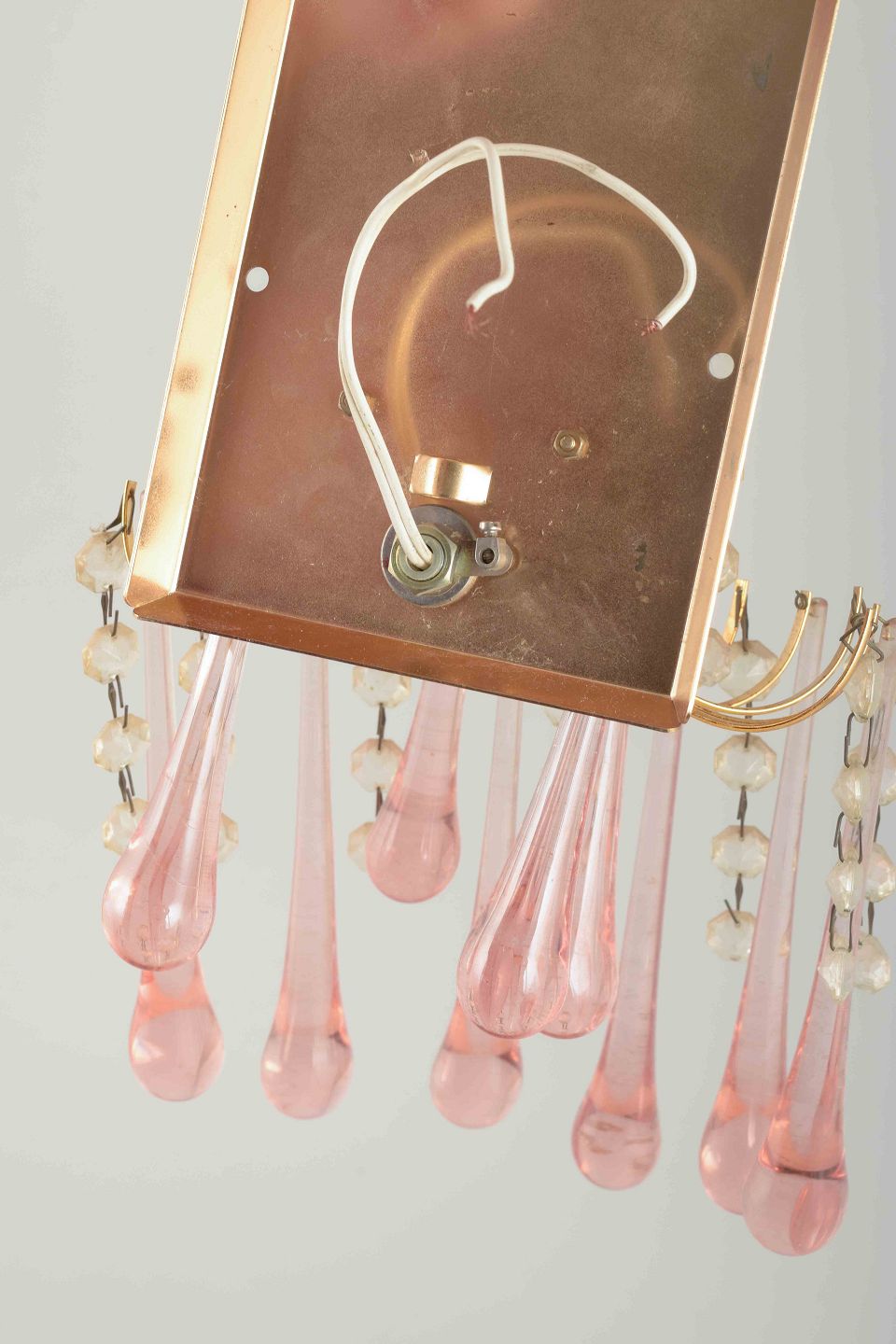 Et par elegante væglamper i messing med ophængte dråbeformede prismer i rosa Murano-glas samt klare glasperler i kæder.