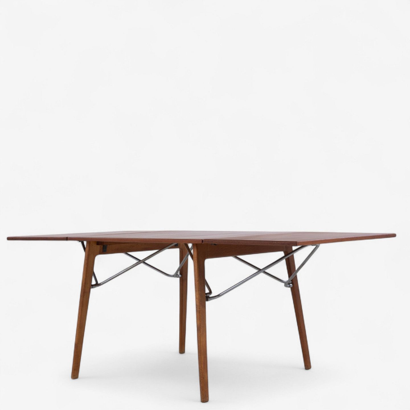 Spisebord med stel i massiv egetræ og top i teak med to tillægsplader.